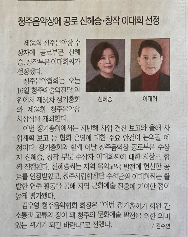 2026년도 청주 음악상 공로부문 수상자에 우리원 신혜승 성악 선생님이 선정 되셨습니다. 축하드립니다!