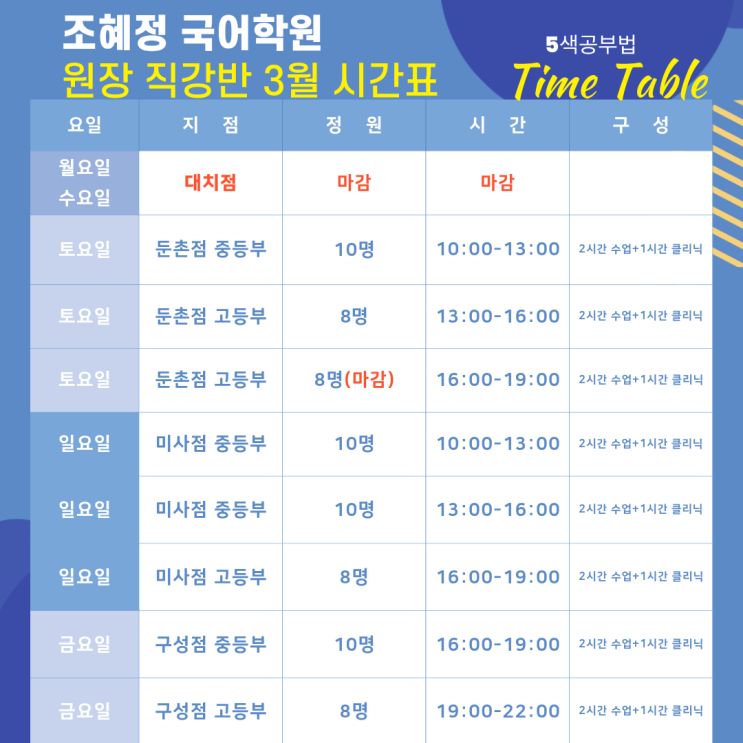 [안내] 봄의 시작, 조혜정 원장과 함께 걷는 국어의 길 (3월 시간표) 안녕하세요, 대치 조혜정 국어쌤입니다. 어느덧 차가운 바람 끝에 봄의 기운이 살짝 묻어나는 계절입니다. 시험이라는 긴 터널을 지나야 하는 우리 아이들에게 3월은 설렘보다 두려움이 앞서는 시기임을 잘 압니다. 그래서 올해 봄, 다시 강의실 문을 열고 아이들 곁으로 다가갑니다. 3월, 강의실에서 피어날 무지개 입시라는 치열한 계절을 지나는 아이들에게, 국어는 때로 넘기 힘든 높은 벽처럼 느껴질지도 모릅니다. 하지만 제가 밤잠을 설쳐가며 준비한 5색의 교재들은 단순한 지식이 아닙니다. 그것은 아이들이 스스로 그어 내려갈 ‘희망의 지도’이자, 차가운 텍....... <img src="https://blogthumb.pstatic.net/MjAyNjAyMDlfMjc0/MDAxNzcwNjM3ODIxMDgx._HJ8joKxFMStsn5CidFEYQCJAyh01ywO9GCWNjdmV9Eg.fjQ7OAEOcYawHnvb96ax7IGEFF3fYEjFQFUH3ThJaWkg.PNG/1.png?type=s3" />