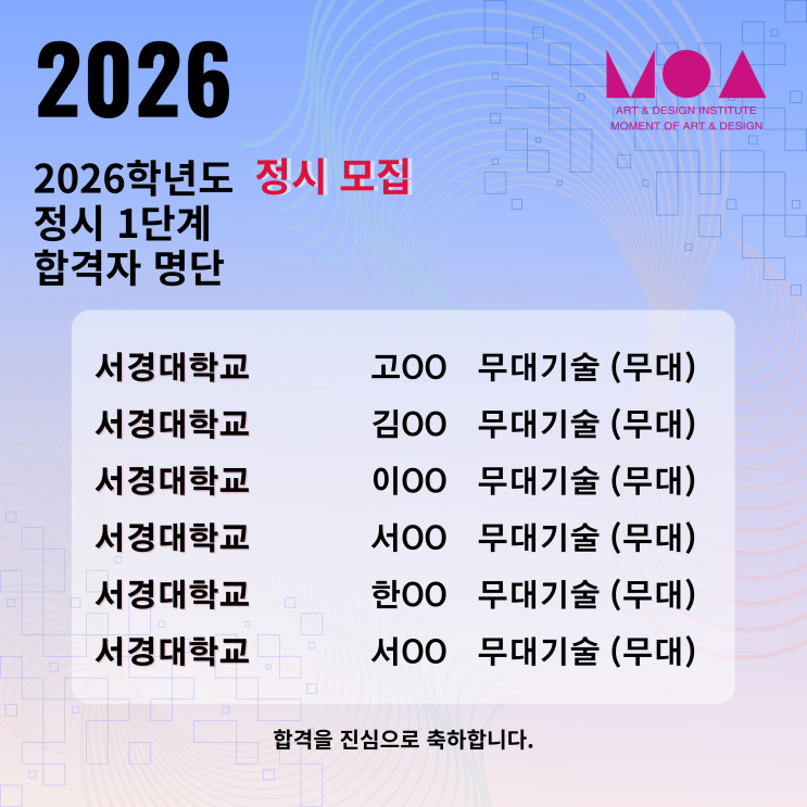 2026학년 서경대학교 무대기술과 정시 1단계 합격자 명단 ※합격을 축하합니다!※ ✨합격을 위한 체계적인 준비!✨ 전문적인 지도와 함께 당신의 예술적 가능성을 확장 하세요! 상담 문의 : 02 - 322 - 4979 / 010 - 2392 - 7680 카카오채널, 인스타DM, 블로그 상담실 문의 가능 <img src="https://blogthumb.pstatic.net/MjAyNjAyMTFfNDAg/MDAxNzcwODA0MzkzNTEy.xRLXzd9eB8kbjQYUpQ_LcE6uRjaVpNX9hDxsaH24Fwwg.jm2El6wCsWnPTKwkN4NwjtxSKgN-eXx6FYqwPvg3WMEg.PNG/%BC%AD%B0%E6%B4%EB_%C7%D5%B0%DD%C0%DA_%B8%ED%B4%DC.png?type=s3" />