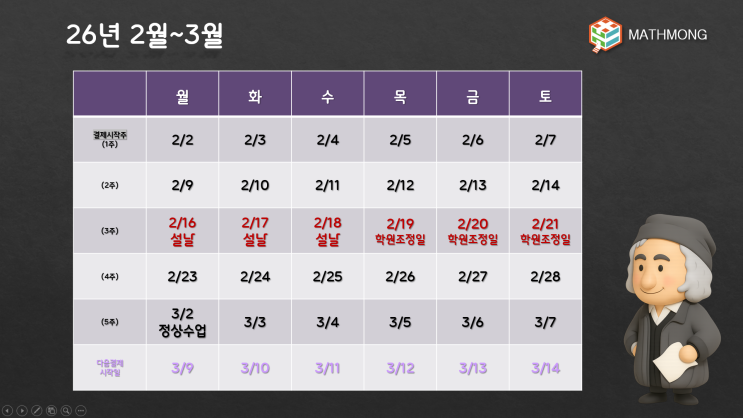 안녕하세요 매쓰몽 충주분원입니다^^ 저희 매쓰몽은 4주과정으로 수업이 진행되고 있습니다. 다음 수업일 안내드리겠습니다. 2월2일 ~ 3월 7일(4주과정) ★2/16(월) - 2/18(수) 설명절 휴강입니다. ★2/19(목) - 2/21(토) 학원조정일로 휴강입니다. ★3/2(월)대체공휴일 정상수업합니다.★ ★ 동화 수업과 교구 수업 활동북은 4주 과정으로 진행되고 있습니다. ★ 통합수강료는 4주에 한번씩 8회차로 결제 됩니다(날짜확인하시어 착오없으시기 바랍니다.) ★ 동화와 교구 수업 시 매쓰몽활동북을 가지고 수업에 임하게 됩니다. 학원측에서 준비됩니다. ★ 동화책은 첫주차 수업 시작되기 전에 미리 준비하셔서 읽고 올 수 있도록 해주시기를 바랍....... <img src="https://blogthumb.pstatic.net/MjAyNjAxMjZfMjgz/MDAxNzY5NDExMzcxNzU2.59YZKpaTxYwcEtgrcaIZ9A7s0M78X0sPYKxiD-fUnHIg.LT9TxNspWzGqsoxE9NZYee8pZ6Pko3ebNWAYUNlUji8g.PNG/image.png?type=s3" />