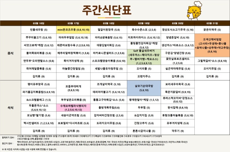 03월 16일 (월) ~ 03월 21일 (토) 급식안내