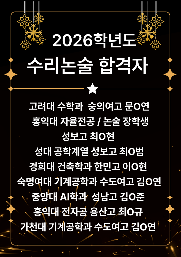 오늘은 바람이 어마어마하게 부네요. 방학은 잘 보내고 계신가요? '방학' 말 그대로 잠시 공부를 내려놓으라고 있는 시간이지만, 우리 친구들은 윈터스쿨이다, 방학 특강이다 해서 오히려 더 바쁜 시간을 보내고 있겠네요. 힘든 공부를 이어가고 있는 모든 친구들, 이룸은 늘 응원합니다. 조금 늦었지만, 2026학년도 수리논술 합격자 명단을 가져왔습니다. 모두 진심으로 축하합니다. 2027학년도 이룸학원 수리논술 개강은 3월 즈음 예상 하고 있습니다. 수리논술에 관심있는 학생의 많은 관심 바랍니다. 신대방 삼거리역 3번 출구로 나와서 직진하면 나옵니다. 문의전화 070.4178.5357 <img src="https://blogthumb.pstatic.net/MjAyNjAxMTBfOTAg/MDAxNzY4MDM5OTYyNTcx.w_c5Brom8YbAu7SS67_nQGVuifwN7KJQOcsvcQiCgOUg.U_6opXAIVhwl_S4beJsCcASC16NFgV6saF0uEx8R2IYg.PNG/%C1%A6%B8%F1_%BE%F8%C0%BD_%2838%29.png?type=s3" />