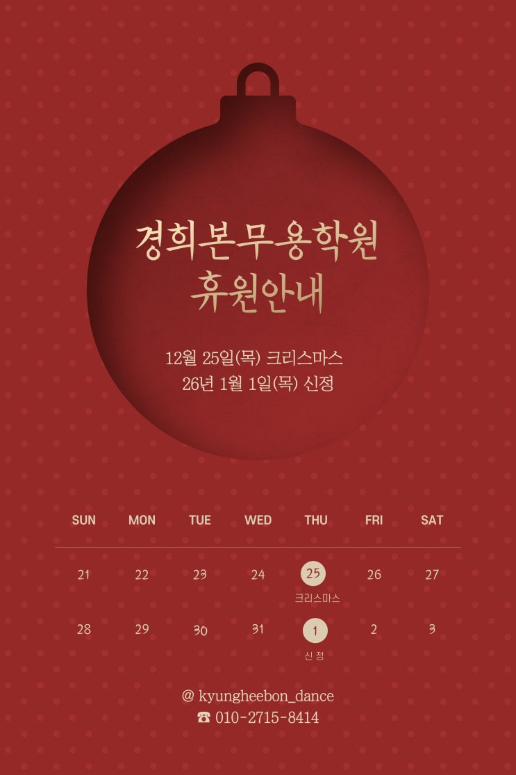 안녕하세요, 경희본무용학원입니다:) 12월 25일 / 1월 1일 휴원합니다❤️ 공휴일인 12월 25일과 1월 1일은 해당 수업일은 자동 이월될 예정입니다❤️ 또한, 선생님들께서 방학기간동안에 더 열심히 수업해주신다고 하셔서 경희본무용학원은 별도 겨울방학이 없습니다. 공휴일 또는 주말에 상담은 가능하나, 다소 느릴 수 있는 점 양해부탁드립니다. 통화가 어려울 시 010-2715-8414로 희망하시는 수업, 경력 여부 문자로 남겨주시면 확인하는대로 연락드리겠습니다. 그럼 가족과 함께 즐거운 연휴보내시고 행복한 새해 맞이한 뒤 1월 5일에 뵙겠습니다. 감사합니다 <img src="https://blogthumb.pstatic.net/MjAyNTEyMDNfMjMw/MDAxNzY0NzUxNjQ2NDg1.yat1CpbkZPD2xeGZMS1JEwc8NvLS-s8tjIcwMiJKRnAg.vfuBnQgmdHbkEXYTaEIJbLKQ1xa9_kJZvHVEmWsmRq8g.JPEG/%C1%A6%B8%F1%C0%BB-%C0%D4%B7%C2%C7%D8%C1%D6%BC%BC%BF%E4_-001_%2876%29.jpg?type=s3" />