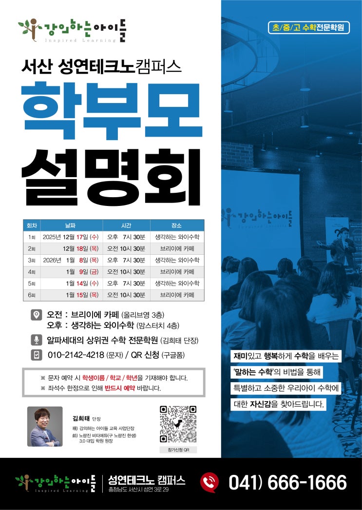 안녕하세요~~ 생각하는 와이수학 입니다. 우리 학원이 수학학원의 핫 브랜드 '강의하는 아이들'로 새롭게 다시 시작하게 되었습니다. ★ 검증된 커리큘럼과 관리 시스템으로 수학 실력을 탄탄하게 키워 드립니다. ★ 더 좋아진 환경에서 학생들이 편하게 집중하며, 성장할 수 있도록 돕겠습니다. ★ 변화된 우리 학원, 직접 설명회에 오셔서 확인해 보세요!! 설명회 신청 : 아래 QR코드 또는 https://forms.gle/PDLLqHtzgJd8RqUs6 또는 문자(010-2142-4218) <img src="https://blogthumb.pstatic.net/MjAyNTEyMDlfMTE2/MDAxNzY1MjY2MDA3NTg5.pEC5b6KaIvXdaR39BwuyvTUf5YSzWvgVS1ObJsqeVPsg.x_87XdRwLQnAb6UL-itRdS6wq_preieR000qCb8l3BUg.JPEG/a4_.%BC%B3%B8%ED%C8%B8%C6%F7%BD%BA%C5%CD_%C8%AE%C0%CE%BF%EB.jpg?type=s3" />
