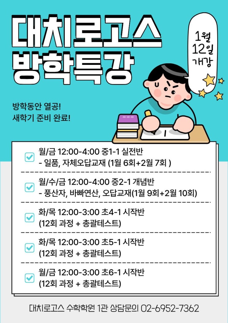 수학을 즐기는 아이들 대치로고스 수학학원 안녕하세요? 대치로고스 수학학원입니다. 초등부와 중등부 학생들을 위한 겨울방학 특강 시간표 안내입니다. 학교마다 방학스케줄이 달라서 개강일이 일정하지 않을 수 있으니, 참고하셔서 수업신청해 주시기 바랍니다. 상담문의하시면 학교별 수업일정 조정해드립니다. 겨울방학동안 열공해서 새학기 준비 잘 할 수 있도록 대치로고스에서 전심으로 지원하도록 하겠습니다. 시간표 안내드립니다. 개별수업 진도는 상담문의 후 수업등록 가능합니다. 학원전화로 연락주시거나, 학교/학년/학생이름으로 문자 보내주시면 상담전화 드립니다. 상담문의 02- 6952-7362 010-8329-7362 #대치로고스수학 #대치....... <img src="https://blogthumb.pstatic.net/MjAyNTEyMDlfMjQ2/MDAxNzY1MjgyMzE3NjI5.61iiJ-gVCPacGWMmlLbDzvxr9r0EILYj73jKkJ-vP1Qg.OX8rF8bWVIlLFOr3gowhpgt6-4kclL8ZVU6Bb2uUWhMg.JPEG/1%B0%FC_2026%B9%E6%C7%D0%C6%AF%B0%AD_%283%29.jpg?type=s3" />