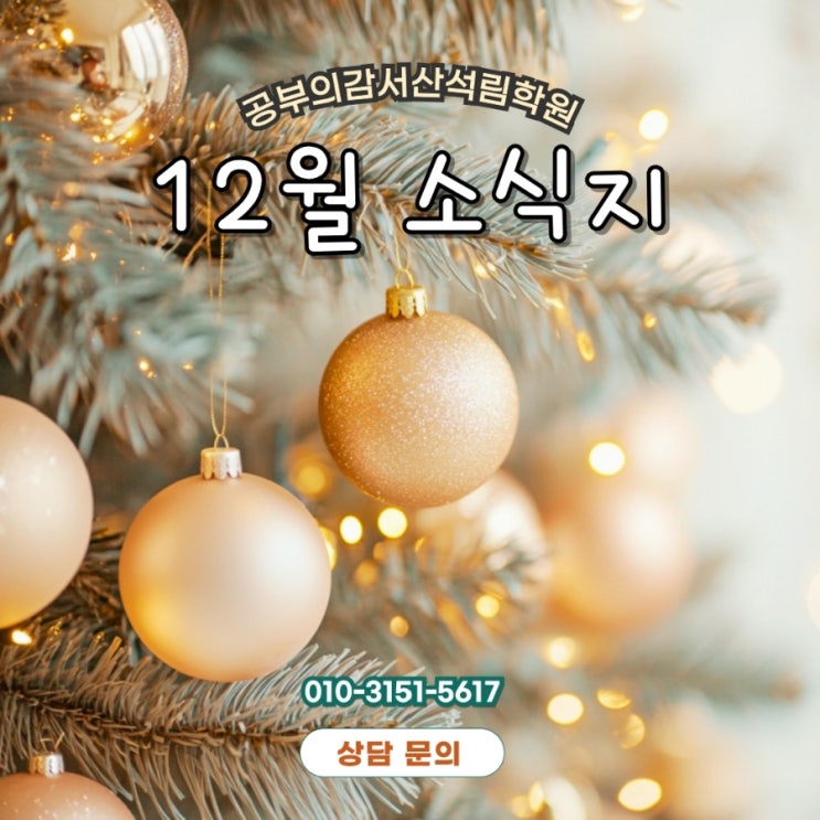 안녕하세요 공감쟁이 에이브에요 어느덧 12월이네요~ 한해동안 수고 많으셨습니다 12월 소식지 올려드리니 참고해주세요 문의사항은 언제든 연락주세요 010-3151-5617 감사합니다 #공부의감서산석림학원 #서산영수학원 #성적이오를수밖에 #연말이벤트 #개인별맞춤지도 #자기주도학습학원 #독서중심국어리드인 #집에는언제가나요 #장학금주는학원 <img src="https://blogthumb.pstatic.net/MjAyNTExMjhfMjI1/MDAxNzY0MzIxODc0OTg3.NT3q5YsYDY1f6FzZwFxhbuXG7FP7zYn9zkiTveXMPqkg.Y7Hreqs4Xj4y5IGVqHpWQMh9ZVBO_vtnwHE24WVum_Qg.JPEG/900%A3%DF1763707055776.jpg?type=s3" />