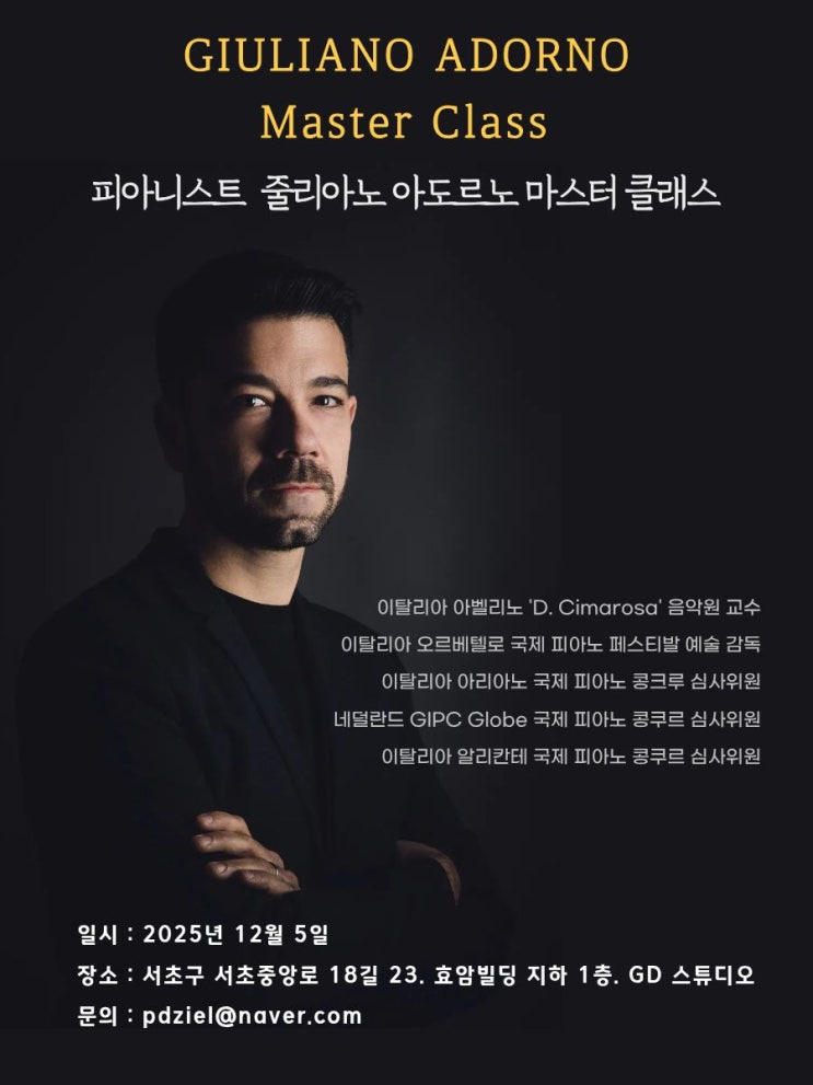 피아니스트 줄리아노 아도르노 마스터 클래스~ 우리 예나 잘했다! <img src="https://blogthumb.pstatic.net/MjAyNTEyMDZfMTI5/MDAxNzY0OTgyNzk2MTA3.eaaFDEK7X-ztxjzg8oj80w9hnv0f1hc8jiVNP-2gNQcg.2K3mOdSe10EakXV8z3l9UIZ6XMPpbcumPuCdjsQhUF0g.JPEG/1764981517400.jpg?type=s3" />