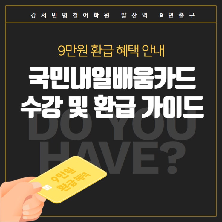 안녕하세요, 강서 민병철어학원입니다! 우리 학원에서는 내일배움카드 소지자분들을 위해 특별 9만원 환급 혜택을 드리고 있습니다. 자기계발을 위해 국민내일배움카드를 활용하시는 스마트한 수강생분들을 위해, 혜택은 챙기고 실수는 줄이는 수강 가이드를 정리해 드립니다. 상담 시 안내드린 내용이지만, 환급 조건을 꼭 지키셔야 환급이 가능하오니 니 꼭 다시 한번 확인해 주세요! ⭐강서민병철어학원 자체 이벤트⭐ 본 과정은 강서 민병철어학원에서 내일배움카드 소지자분들을 위해 특별히 마련한 '자체 환급 프로모션'입니다. 고용노동부 HRD 사이트에는 저희 학원 명단이나 해당 과정이 등록되어 있지 않습니다. HRD 사이트가....... <img src="https://blogthumb.pstatic.net/MjAyNjAzMjVfNzkg/MDAxNzc0NDA4NTIyNjEw.z-GM5aWXRiDBnTIop_86BVn2cYCqxfsG_dip2Qxld50g.-eKGUZSmcjslLF8oouslRXg_a6zjYCH2mFtuA29Gp-cg.JPEG/2024%B3%E2_5%BF%F9_%B3%BB%C0%CF%B9%E8%BF%F2%C4%AB%B5%E5_%B1%B9%B9%CE%B3%BB%C0%CF%B9%E8%BF%F2_%281%29.jpg?type=s3" />