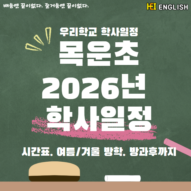 헤이잉글리쉬가 목운초 학부모님들을 위해 꼼꼼하게 정리했어요! 안녕하세요, 목동 헤이잉글리쉬입니다! 3월이 되면 학교 앞에는 새 가방을 맨 아이들의 설레는 발걸음이 가득해지죠. 새 학년, 새 선생님, 새 친구들과 함께하는 1년은 아이들에게 정말 특별한 시간입니다. 그 소중한 1년을 알차게 계획하기 위해서 가장 먼저 필요한 것이 바로 학사일정이에요! 헤이잉글리쉬가 목운초등학교 2026학년도 학사일정을 학부모님들이 한눈에 보실 수 있도록 정리해드렸습니다. ━━━━━━━━━━━━━━━━━━━━━━━━━━━━━━ 1학기 주요 학사일정 2026. 3. 1.(일) ~ 8. 19.(수) | 수업일수 98일 ━━━━━━━━━━━━━━━━━━....... <img src="https://blogthumb.pstatic.net/MjAyNjAzMTRfMTQ0/MDAxNzczNDk1OTYyMTg1.XhLQ1uMabR3QE0RVqZH4NnMsj-EhMDZKiS4pXi0CBxwg.SSL2SMuF_AETMoIo7K2IcvIIGN3IHsJGSbYrq-AWDUEg.PNG/image.png?type=s3" />