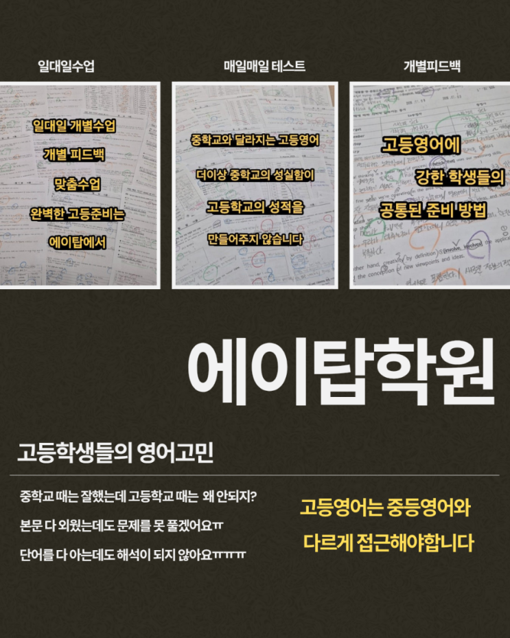 안녕하세요. 공부의 맛을 알다 에이탑 학원 수진쌤입니다. 기말고사가 끝나고 우리 에이탑의 예비 고1 학생들이 고등과정을 공부한지 거의 한달이 지났습니다. 한달동안 중학교의 공부법에서 고등학교의 공부법으로 열심히 바꾸어 가고 있습니다. 그동안 우리 에이탑 학원 학생들이 어떻게 공부를 했는지 보여드릴께요. 중학교 영어에서 고등학교 영어로 바뀌는 시점에서 많은 변화가 있었습니다. 단어는 수준도 어려워졌지만 하루에 암기해야 할 양들도 늘었습니다. 열심히 단어장을 들고 다니면서 열심히 암기하지만 쉽지가 않죠 선생님! 단어를 계속 암기하는데도 잘 안외워져요.ㅠㅠ 네~ 원래 단어를 계속 암기해도 잊는건 정상입니다. 그래....... <img src="https://blogthumb.pstatic.net/MjAyNjAxMTBfMTI2/MDAxNzY4MDI0NDA1NTQ4.l3_iYl4mc_7rNI66bm_BXJXlj3le37bDgkCAxykFfC0g._tXDba6A05DIFWxvHDEnzDyEIrv8EUmf2F6KULl3XiQg.PNG/900%A3%DF%BF%A1%C0%CC%C5%BE%C7%D0%BF%F8%A3%DF20260110%A3%DF144818%A3%DF0000.png?type=s3" />