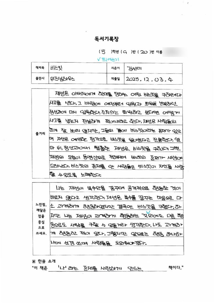 안녕하세요. 영등포구 유일 2년 연속 우수 운영점 선정 리드인 영등포 대방초점 입니다. 이번 달에도 우리 아이들이 책 속에서 느낀 생각과 감동을 독서노트에 담아냈습니다. 이번달에도 우리 아이들은 책속 생각을 나만의 언어로 풀어내며 문해력, 사고력, 글쓰기 능력이 함께 자랍니다. Q. 독서노트란 무엇인가요? A. 독서노트는 책을 읽은 후 그 내용과 느낀 점을 자신의 말로 정리하여 기록하는 활동 입니다. 책 속의 생각을 나만의 언어로 풀어내며 문해력, 사고력, 글쓰기 능력이 함께 자랍니다. ✨ ✨12월 독서 노트 왕 ✨ ✨ ✨12월 우수 독서노트 ✨ 수상을 축하합니다 ✨✨이달의 독서노트 왕 ✨✨ 책 제목 : 비스킷 선생....... <img src="https://blogthumb.pstatic.net/MjAyNjAxMTNfOTYg/MDAxNzY4MjgwODg2NTg3.Ra29hGQEesZIb9WyBl66aAcqQfVgh3_Pt44VjZLgF7wg.Ch_FwCEIi2e54UIhsG0drKsGV8NmjH9k5I_JsP4PxEkg.JPEG/%B4%EB%BB%F3.jpg?type=s3" />