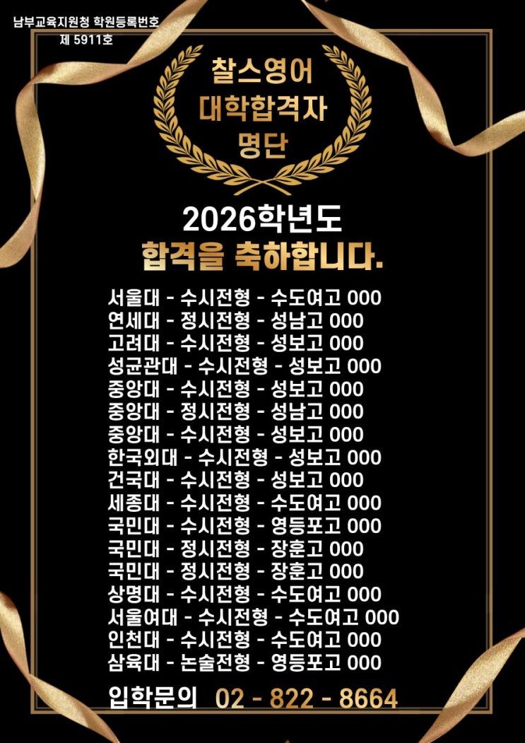 [보라매영어학원][신길동영어학원] 2026학년도 찰스영어 대학합격자 명단 (서울대합격, 연세대합격, 고려대합격 외 다수)