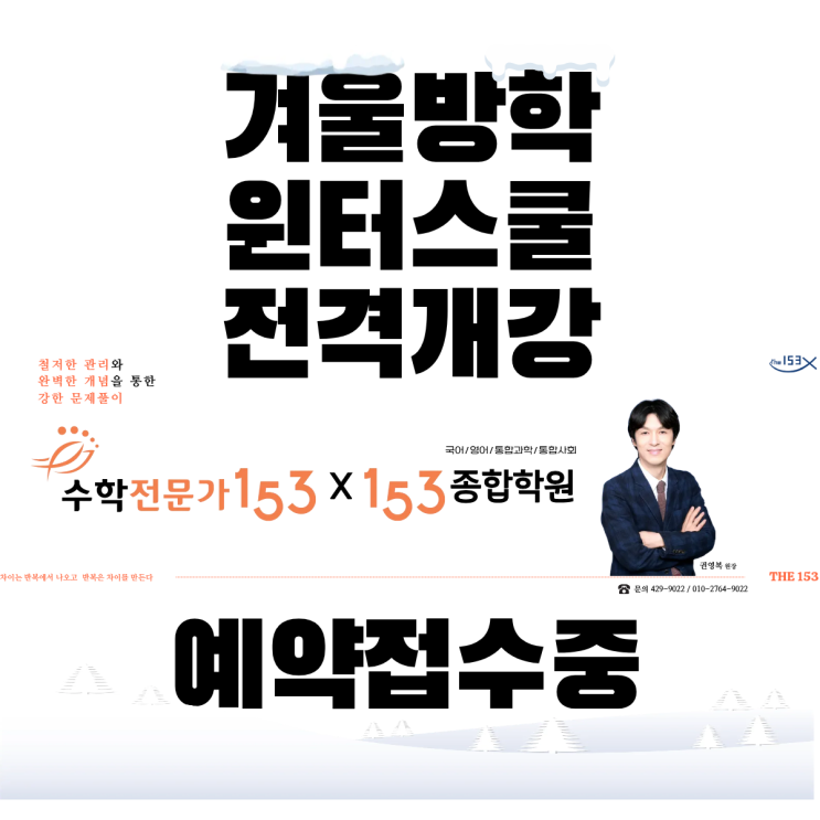 명일동 수학학원 윈터스쿨 개강: 예비 고등학생 수학 성적, '결정적 40일'에 승부하라 (명일동 수학학원 윈터스쿨) 안녕하세요, 고등 수학 성적 향상 전문 153종합학원입니다. 고등학생이 되면서 성적에 가장 큰 변수가 되는 과목은 단연 **수학**입니다. 중학교 때와는 차원이 다른 난이도와 방대한 학습량 때문에, 많은 학생이 수학에서 좌절하고 학습 동기를 잃기 쉽습니다. 하지만 반대로 생각하면, **겨울방학 동안 수학에 집중 투자**한다면, 다른 학생들과의 격차를 가장 확실하게 벌릴 수 있는 절호의 기회이기도 합니다. 저희 153종합학원은 이러한 수학 학습의 중요성을 바탕으로, **예비 고1, 예비 고2, 예비 고3 전 학년 대....... <img src="https://blogthumb.pstatic.net/MjAyNTEyMDdfMjU5/MDAxNzY1MTAwNzc3NTgw.cLtsPy5zRz2vllZH38lDzl4dnsYRWs98qrbLamwd24Eg.KMJ1j7YiZsYJMfQjInMzlE8A_hzGIglP5Xq_1QshlSsg.PNG/%3F%84%A4%3F%9D%B4%EB%B2%3F_%EB%B8%94%EB%A1%9C%EA%B7%3F-%3F%8A%A4%3F%82%A8-_%EB%B3%B5%EC%82%AC%EB%B3%3F.png?type=s3" />