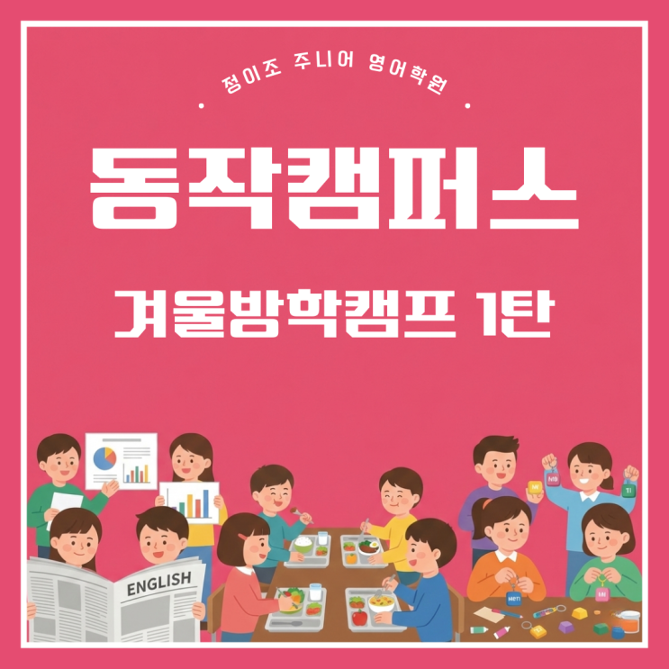 안녕하세요, 정이조주니어영어학원 동작캠퍼스입니다. 이번 포스팅에서는 많은 관심과 성원 속에 성공적으로 마무리된 정이조주니어 동작캠퍼스 첫 겨울방학캠프를 소개해드리려고 합니다. 1월 8일부터 1월 27일까지, 총 14일간 진행된 이번 겨울방학캠프에는 40여 명의 학생들이 참여해 학습과 활동으로 하루하루를 알차게 채웠습니다. 처음 진행한 캠프였음에도 불구하고, 아이들의 만족도와 반응이 특히 뜨거웠던 시간이었습니다. 겨울방학캠프에서는 어떤 공부를 했을까요? 첫 번째 핵심 프로그램은 바로 ‘영자신문 수업’입니다. 영자신문은 단순한 영어 읽기를 넘어, ✔ 실제로 사용되는 영어 표현 ✔ 시사 이슈와 배경지식 ✔ 주제별 어....... <img src="https://blogthumb.pstatic.net/MjAyNjAyMDVfMTIw/MDAxNzcwMjU2NjU1NzI5.BiJTu2_93MH4gHWVIoU0wLeS1gr7tT_vyb1kugNydDog.UgIW6kMwc8UcIaUJYrAJujz15ELM8fPmvwB-9Nfg0Pwg.PNG/1231234.png?type=s3" />