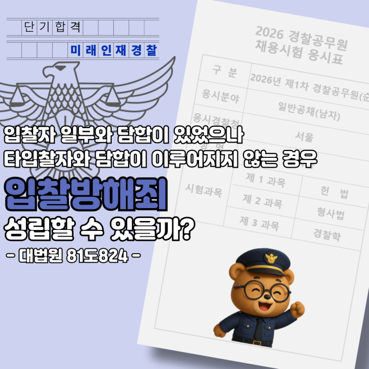 안녕하세요, 미래인재 경찰학원입니다. 요즘 날씨가 많이 풀린 것 같은데, 다들 감기 걸리신 건 아니시죠? 오늘도 판례 이야기를 봐주시러 오신 여러분들을 환영합니다! 그냥 잠깐 쉬어가듯 들른 분들도 환영해요. 편한 마음으로, 그냥 슥 넘기듯 봐주세요! 오늘은 입찰방해죄 판례를 하나 가져왔습니다. 대법원의 원칙과 쟁점에 대해서 한 번 풀어봤으니, 궁금하신 분들은 끝까지 읽어주세요! 타입찰자와 담합이 이루어지지 않는 경우, 입찰방해죄가 성립할 수 있을까요? 대법원 81도824 판례를 통해 입찰방해죄의 요건에 대해 한 번 자세히 알아보겠습니다. 1️⃣ 사건의 배경 입찰 전, 이런 제안이 오갔습니다. "이번 입찰, 서로 너....... <img src="https://blogthumb.pstatic.net/MjAyNjAyMDVfMTY0/MDAxNzcwMjU2NTU5MDA5.9vXmqS6qkUMpeeIxWOa3l40WRtpG27MySyfGg_4j8-0g.LdNX9KR3oZ7AksdPAzocyV_3FHccDOphcerL-v0mwZkg.PNG/001.png?type=s3" />