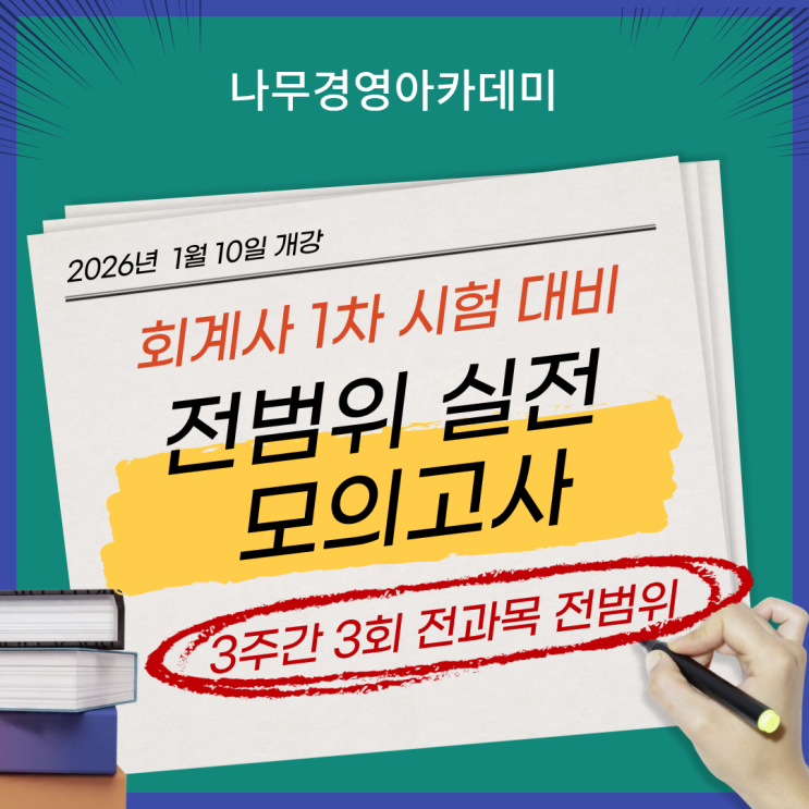 안녕하세요? 나무경영아카데미입니다. 새해가 밝고, 이제 2026 공인회계사 1차 시험도 두 달 앞으로 다가왔습니다. 오는 3월 2일 치러지는 시험에서 여러분의 꿈이 이루어지기를 바랍니다. 정말 오랜 시간동안 땀과 눈물을 쏟으며 공부하셨을텐데요, 아무리 오래 준비한 시험이라도, 막판 마무리 기간을 어떻게 보내느냐에 따라 결과는 완전히 달라집니다. 특히 회계사 1차 시험처럼 범위가 방대하고 난이도가 높은 시험은 더 그렇습니다. 이제는 ‘공부를 더 하는 것’보다, 내가 가진 실력을 실제 시험장에서 얼마나 정확하게 쏟아낼 수 있느냐가 합격의 관건입니다. 쏟아부은 시간만큼 결과가 나오지 않는 이유 시험이 코앞으로 다가오면 수험....... <img src="https://blogthumb.pstatic.net/MjAyNjAxMDhfMjEg/MDAxNzY3ODI1NDA5MTM2.Gy091rsXg_AwHOLBhdgnE_EOjEZhkUFUnFiVG3Fg4Vsg.v4of5EpGxFfmMXOWfgMljAhDFte2xuPLUB6AldGDjXQg.PNG/%C1%A6%B8%F1%C0%BB_%C0%D4%B7%C2%C7%D8%C1%D6%BC%BC%BF%E4.-_%BA%B9%BB%E7%BA%BB_%281%29.png?type=s3" />