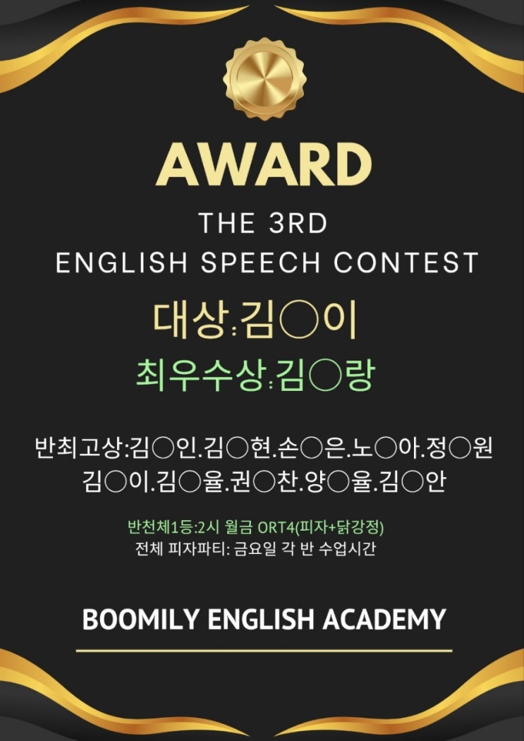 안녕하세요. 김천 율곡동 초등영어학원 부밀리영어학원입니다. 11월 한 달간 열심히 원서말하기를 준비하고 지난주 한명도 빠짐없이 대회에 참가하였는데요. 모두들 자신있게 연습하고 참여 해 준 덕에 무사히 마무리 할 수 있었습니다. 대망의 대상은 초2학년 김○이 학생 당당한 목소리와 자신감있는 제스쳐로 월등히 높은 점수를 받아 대상을 받게되었습니다. 최우수상은 초4. 김○랑 학생 이번 대회에 준비한 스크립트가 조금 길어서 준비기간 고생도 많이 했는데요, 끝까지 열심히 준비하고 실수가 표나지않을정도로 자연스럽게 마무리까지 하여 높은 점수를 받았습니다. 모두들 열심히 해주어서 솔직히 우열을 가리기 정말 힘들었습니다.ㅜ....... <img src="https://blogthumb.pstatic.net/MjAyNTEyMTBfMTMw/MDAxNzY1MzcxNTg2NjI1.G65OrMZf9nJHWUw-J_ubhDimWrKA_dKezAmc2MYanNwg.I2KfhJIE_JYLN-jSqkgOtyzgnyIJ4jbiyzhdw-8mORkg.JPEG/900%A3%DF1764756827144.jpg?type=s3" />