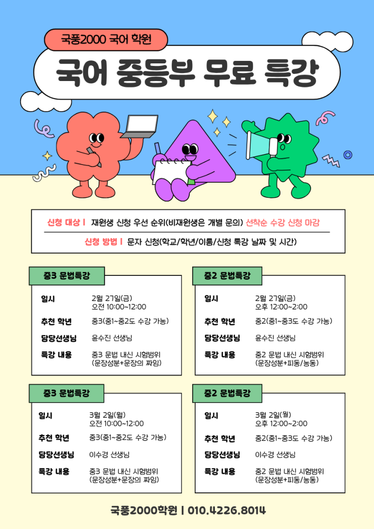 [국풍2000학원][경산국어학원] 안녕하세요 국풍2000학원입니다. 중고등부 무료 특강을 실시합니다. 보내드린 시간표를 참고하셔서 수강 신청해주시면 됩니다. - 재원생 우선 신청으로 받고 있습니다.(비재원생 별도 문의) - 선착순 수강 신청 마감합니다. - 복수 수강 신청 가능합니다. 고1~고2들은 3월 모의고사를 대비하여 모의고사 진행합니다. 중2~고1들은 내신과 연계되는 문법 특강을 진행합니다. 각 특강 과목별로 추천 학년 및 수업 시간이 적혀있으니, 확인해보시고 신청해주시면 됩니다. 학생들을 위한 특강으로, 반드시 사전에 스케줄 확인하셔서 신중한 신청 부탁드립니다. 신청하신 후, 당일 취소 및 결석할 경우에....... <img src="https://blogthumb.pstatic.net/MjAyNjAyMjBfMjUy/MDAxNzcxNTg1NzM2NDgx.ED9e3okrjAUBxFHLHe1QZIIAe_tayBjImybA9VpxLQog.FXA2AGAZcFzVP6bMBEizL53yI7zF5KXlZ-EIUWfOSbkg.PNG/%C1%DF%B5%EE%BA%CE_%B9%AB%B7%E1_%C6%AF%B0%AD.png?type=s3" />