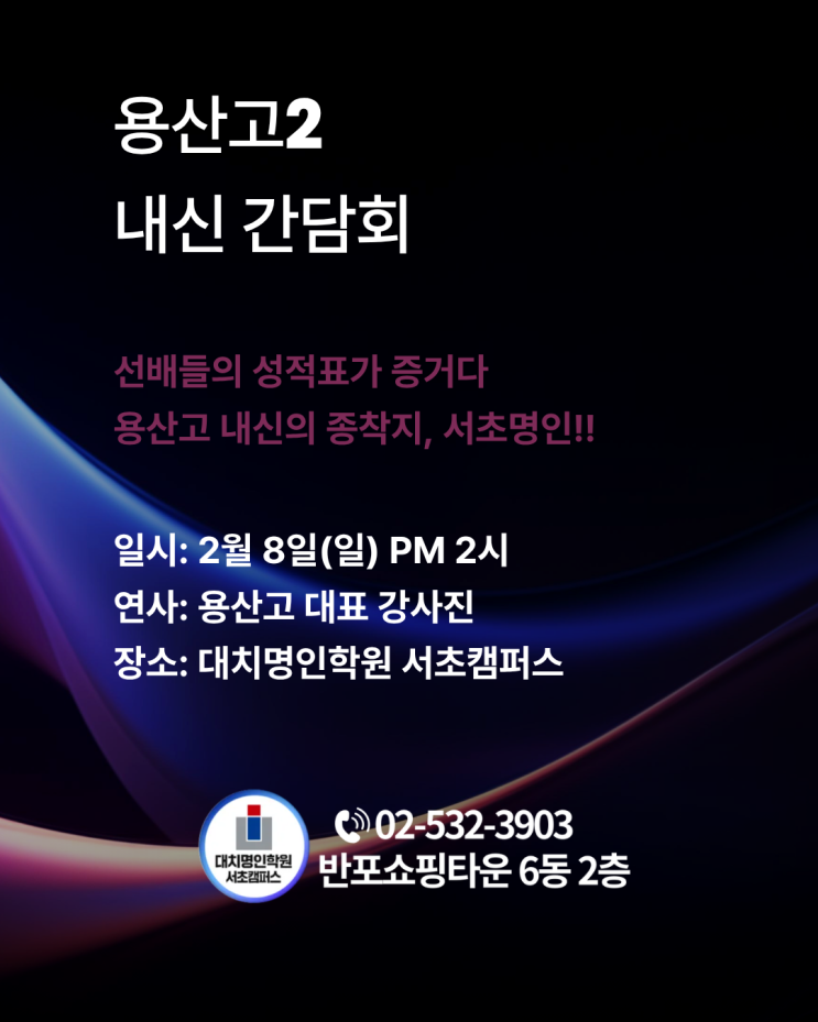 용산고 학부모님들! 점점 치열해지는 내신 경쟁 속에서 우리 아이의 성적을 결정지을 중요한 2학년이 시작됩니다. "왜 용산고 상위권은 결국 서초명인으로 모일까요?" 그 이유는? 명확합니다. 2025년 한 해 동안 100점 배출은 물론, 주요과목 전교 1등 및 1등급 다수 배출이 서초명인의 용산고 내신 전문성을 증명하고 있기 때문입니다. 용산고 내신의 종착지! 서초명인학원에서 '용산고2 전용 내신 간담회'를 개최합니다. 예약 : https://vo.la/GogV2SS 좌석이 한정되어 있으니 빠른 예약 부탁드립니다. 우리 아이를 주인공으로 만들 기회, 놓치지 마세요! 용산고2 내신, 무엇이 달라지나요? - 1학년 때와는 차원....... <img src="https://blogthumb.pstatic.net/MjAyNjAxMjVfMjE0/MDAxNzY5MzM1MDA0MDYx.sHvjxEKQxqi1xp86QyDD_L4CDR_iUK_i1-k_4Hthee4g.rsPC6yRQPURw3Y_Uqmp46hlNcCZRy74nutU5g2AVS4kg.PNG/0208%BF%EB%BB%EA2%B0%A3%B4%E3%C8%B8.png?type=s3" />