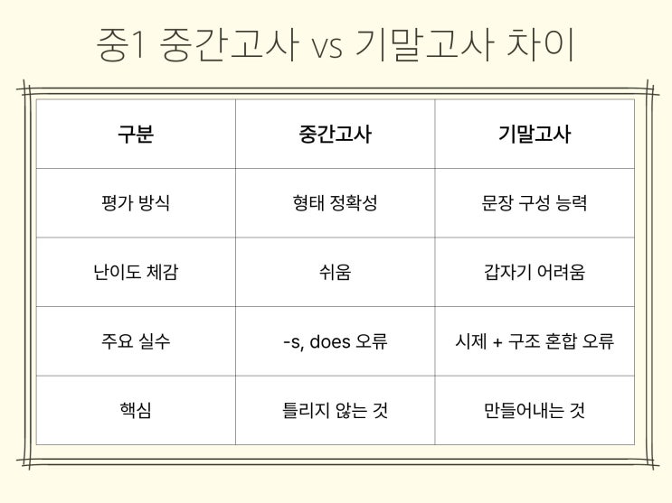 초등 고학년 또는 중1 학부모님들과 상담을 하다 보면 이런 질문을 자주 받습니다. “중1은 자유학기제라 시험이 없지 않나요?” “그래도 혹시 시험을 본다면 어디까지 준비해야 하나요?” 학교마다 운영 방식은 다르지만, 만약 자유학기제가 아니라면 중간고사 1~2과 / 기말고사 3~4과 범위로 진행되는 경우가 많습니다. 오늘은 영어교과서 천재교육 (이상기) 1~4과 핵심 문법과 시험 대비 포인트를 정리해 보겠습니다. 현동 구산중 포함 요즘 영어는 단순 문법 확인 시험이 아닙니다. 문장 생성 능력과 변형 능력을 평가하는 서술형 중심 구조입니다. 따라서 중1 1~4과는 단순 기초 ‘입문 단원’이 아니라, 중등 영어의 뼈대를 만드는 내....... <img src="https://blogthumb.pstatic.net/MjAyNjA0MDVfMjE3/MDAxNzc1Mzk1MjE0OTYz.KyoMS53WnMIdtBbm80k5iNsg6bqOMEAr8URJyrVrZpMg.4Uus1o7PisyyN4FqseUbzaUqQZBf4AtVuM29aZQiSaog.JPEG/%C1%A6%B8%F1%C0%BB_%C0%D4%B7%C2%C7%D8%C1%D6%BC%BC%BF%E4._%2814%29.jpg?type=s3" />