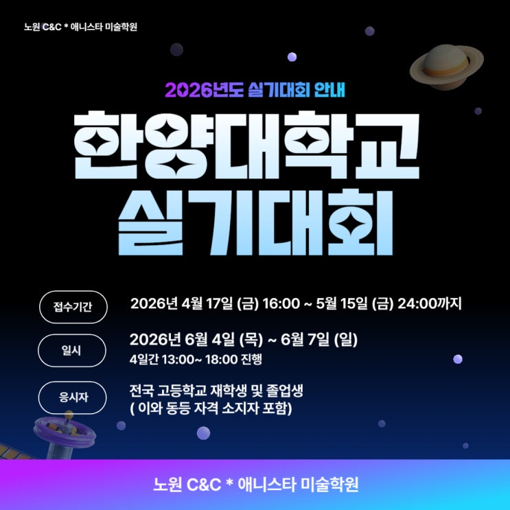 안녕하세요~ 노원씨앤씨*애니스타 미술학원입니다 오늘은 한양대학교 실기대회 안내를 드리러 왔어요~! 장소는 한양대 에리카여서 서울에 사는 친구들은 접근이 어렵긴 하겠어요 ㅠ 그치만 주제어가 나와있는 몇 안되는 학교 중에 하나니까 도전해봐도 좋을 것 같습니다 | 주최 한양대학교 ERICA 캠퍼스 | 일시 2026년 6월 4일(목) ~ 2026년 6월 7일(일) 4일간 ※ 시험은 오후 1시부터 시작됩니다. - 고사장 입실시작은 11시40분부터 가능합니다. - 참가자는 대회일시 30분 전까지 입실합니다. (지각자 입실 불가) | 장소 한양대학교 ERICA캠퍼스(경기도) | 참가자격 전국 고등학교 재학생 및 졸업생 (이와 동등 자격 소지자 포함) - 고등1부....... <img src="https://blogthumb.pstatic.net/MjAyNjAzMjdfMjMw/MDAxNzc0NjEzNTI2ODk2.IdwLHEdL7axuYpdA4v7KTEarSCtZD5K5BfCVrlgkMLog.i2BaVcsBV5KHBMGldJO8GbCzW-YW0GbPVQyhf5ZbtvAg.JPEG/002.jpg?type=s3" />