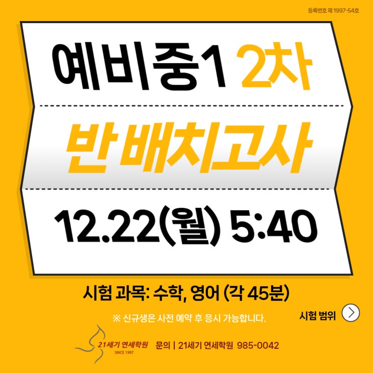 2025. 예비중1 (현초6) 2차 반 배치고사 안내입니다. ● 반배치고사 일시 : 12월 22일(월) 오후 5시40분- 7시20분 ● 시험과목 : 영어, 수학 (각 45분) ●시험범위 : 본 내용 <사진이미지 2> 참고 철저한 관리! 확실한 결과! since 1997. 입시명문 21세기 연세학원 만의 체계적인 커리큘럼과 관리 노하우로 강북·성북·도봉지역 중학교 내신은 물론 개인 학습역량을 더욱 UP 시킬 수 있도록 도와드리겠습니다! ※ 신규생은 사전 예약 필수입니다. ◆ 문의사항은 본원 985-0042 번호로 전화주시면 자세히 상담 도와드리겠습니다. 언제나 가르침에 열정적인 21세기연세학원이 되겠습니다. 감사합니다! <img src="https://blogthumb.pstatic.net/MjAyNTEyMDVfMjA1/MDAxNzY0OTE0MjczNTk5.01WySjTuiGFCsU_9DezUPNmmuUQ9N0HF1QA-Q1_pgUcg.XRmb1yYRnAOCuRwEM1feGPiM0xiLOglcXv7_q84NRiYg.JPEG/2025%BF%B9%BA%F1%C1%DF1_2%C2%F7%B9%DD%B9%E8%C4%A1.jpg?type=s3" />