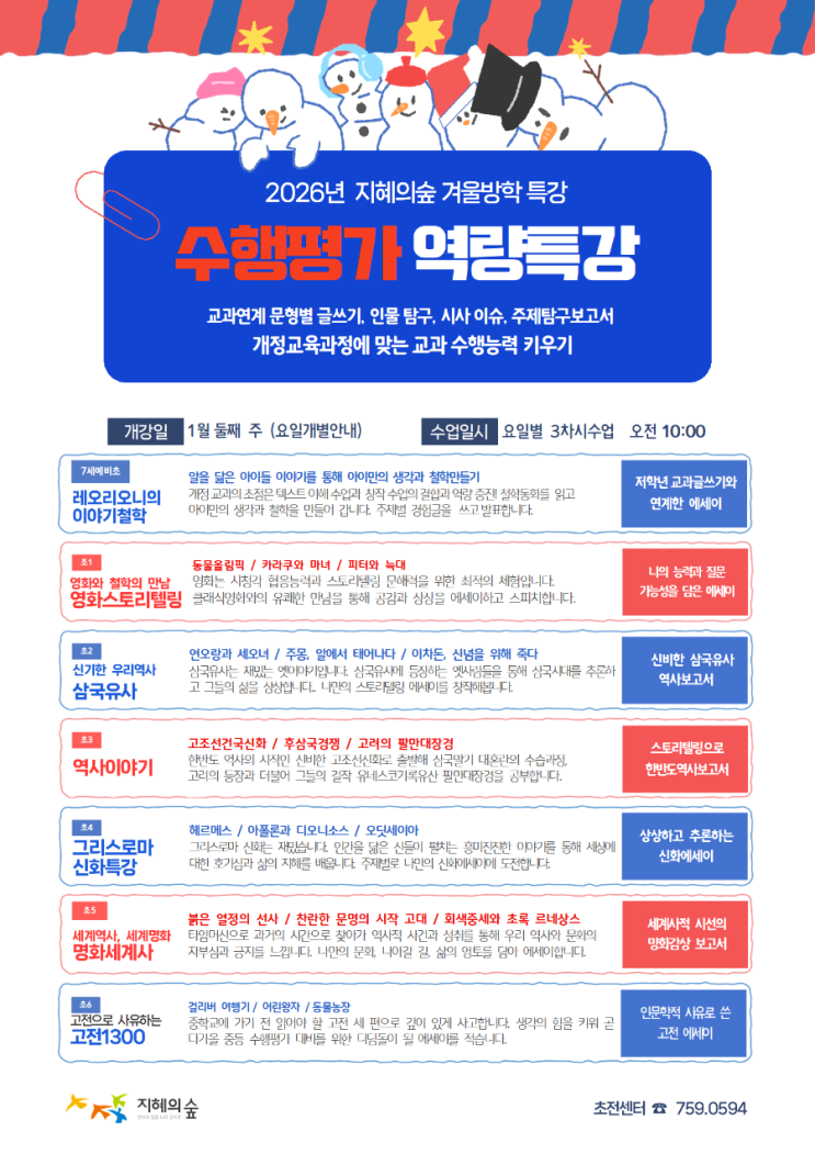 이번 겨울방학 동안 신나고 유익한 특강프로그램으로 언어사고력을 향상시켜요. 요즘 시험은 사고력이 대세인 것 같아요. 풍부한 독서와 풍성한 질문능력, 산뜻한 글쓰기의 세 단계로 생각의 힘과 지혜로움이 새록새록 생겨납니다♡ <img src="https://blogthumb.pstatic.net/MjAyNTExMTRfMjEy/MDAxNzYzMTA4MzY4MzMz.o8l5CnflBJPUiemchSSu-fSB0YFBxLEtjstFJyxJ1L4g.mGaT4wismu_Ub29qXyIRc7qoECM1YkgotNLRe_IXXsUg.PNG/900%A3%DF1763108027109.png?type=s3" />
