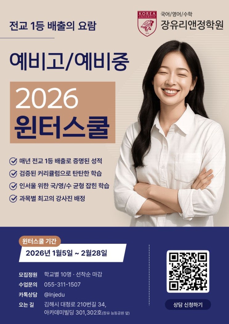 안녕하세요 장유리앤정학원입니다. 드디어 2026년 예비중/ 예비고 윈터스쿨 모집을 시작합니다. 성적은 겨울방학 때 얼마나 준비하는가에 따라 1년 성적이 결정됩니다. 리앤정학원 윈터스쿨 출신들이 전교 1등을 하고 있는 것에서 증명됩니다. 윈터스쿨을 여러차례 진행하면서, 어떻게 해야 학기 중 학생들이 성적이 나오는지 끊임없이 연구했습니다. 이제는 안정적으로 성과를 낼 수 있는 커리큘럼과 학습방법이 자리 잡혀 있습니다. 믿고 참여해주시면, 반드시 좋은 성적으로 보답하겠습니다. 대상 : 예비중/ 예비고 과목 : 국어, 영어, 수학 (각 전문 강사진) 기간 : 2026년 1~2월 (예비고의 경우 11~12월 pre윈터스쿨 참여 추천) 모집 : 2025....... <img src="https://blogthumb.pstatic.net/MjAyNTExMTBfMjEx/MDAxNzYyNzc2OTQ2MDU2.3UroA-oReRVqAJvIJZTLnoEC7KRK3IbpVgjAd8kZs7Qg.HVBiLvUGmsVL36I56KrW13u4u6l-j3HohVuuOwHYFEIg.JPEG/1.jpg?type=s3" />