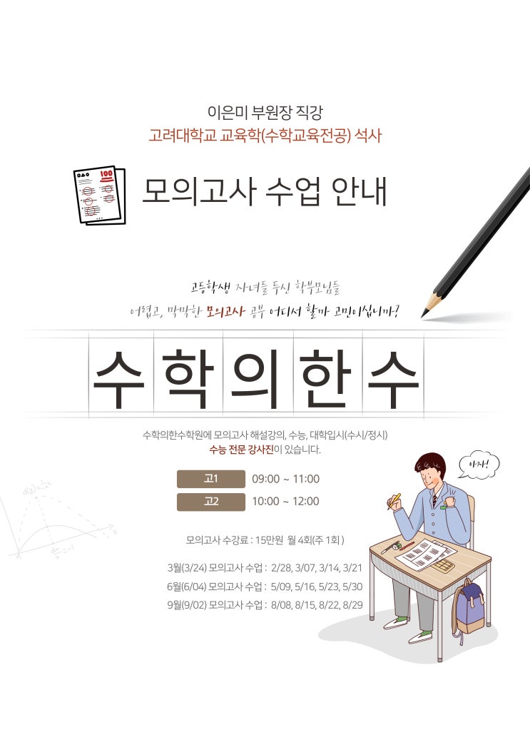 이은미 부원장 직강 / 고려대학교 교육학(수학교육전공) 석사 안녕하세요, 수학의한수학원입니다. 고등학생 자녀를 둔 학부모님들이 가장 많이 고민하는 것이 바로 모의고사 대비입니다. “어디서 어떻게 준비해야 하나요?” “사설 모의고사가 너무 어려운데 분석을 어떻게 해야 할까요?” “아이가 시험 볼 때마다 점수 폭이 너무 들쭉날쭉해요…” 이런 고민을 해결해 드리기 위해 수학의한수학원에서 ‘모의고사 전문 수업’을 개설합니다. 왜 수학의한수 모의고사 수업인가? ✔ 1. 수능 전문 강사가 직접 분석·해설 이은미 부원장님의 직강으로, 단순히 문제 풀이가 아니라 수능형 사고력·문제 접근법·오답 패턴 분석까지 잡아드립니다....... <img src="https://blogthumb.pstatic.net/MjAyNTEyMDNfMTQz/MDAxNzY0NzU3NjQ3NzU3.HxaIk6niZIOiQR-PlhPpI3ojQYMcsZ0rNoq5pW4P2nMg.U4ytCY9M17CatHJpcUZIUKZu6ovbADF0ecessQU03F0g.JPEG/temp_1764757433763.-618339260.jpeg?type=s3" />