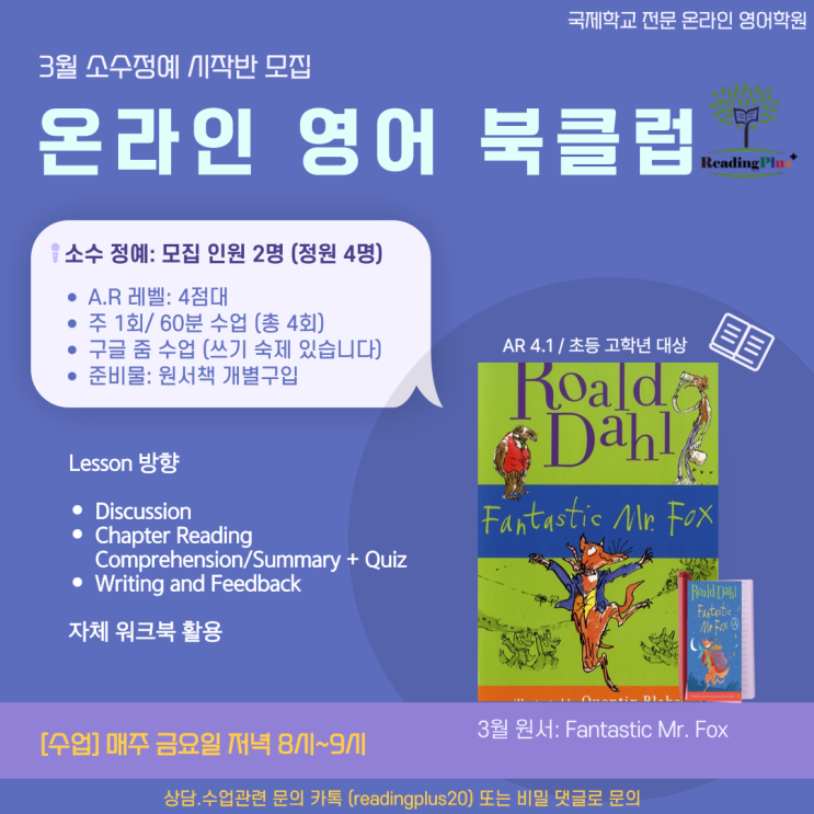 안녕하세요, 제주 리딩플러스 아카데미 Bella 원장입니다! 새학기가 시작되면서 아이들의 영어 원서 읽기 습관을 제대로 잡아주고 싶으신 학부모님 많으시죠? 저희는 소수정예(최소 2명~정원 4명)로, 아이 한 명 한 명의 수준과 속도에 딱 맞춰 수업을 진행합니다. 3월 시작반 책 & 수업 정보 이번 3월은 Roald Dahl의 명작으로 시작해요! 책 제목: Fantastic Mr. Fox (판타스틱 미스터 폭스) AR 레벨: 4.1 대상: 초등 고학년 (AR 4점대 입문~중급) 총 회차: 4회 (책 분량에 따라 조정) 수업 요일: 매주 금요일 저녁 8:00 ~ 9:00 (총 60분) 수업 방식: 온라인 줌 (ZOOM) #AR4점대 #영어원서 #북클럽 #온라인영어 #RoaldDahl #Fantas....... <img src="https://blogthumb.pstatic.net/MjAyNjAzMDJfMjY0/MDAxNzcyNDQ2MTU3MzY5.2thpsNdBk4uNl8aiSB2LNlGI723Y6L_quapK3Ue7QMwg.XTZywSAytICxedpg7Lh3ZBRnfUkgAYMxIOtf62YHA6cg.PNG/001.png?type=s3" />