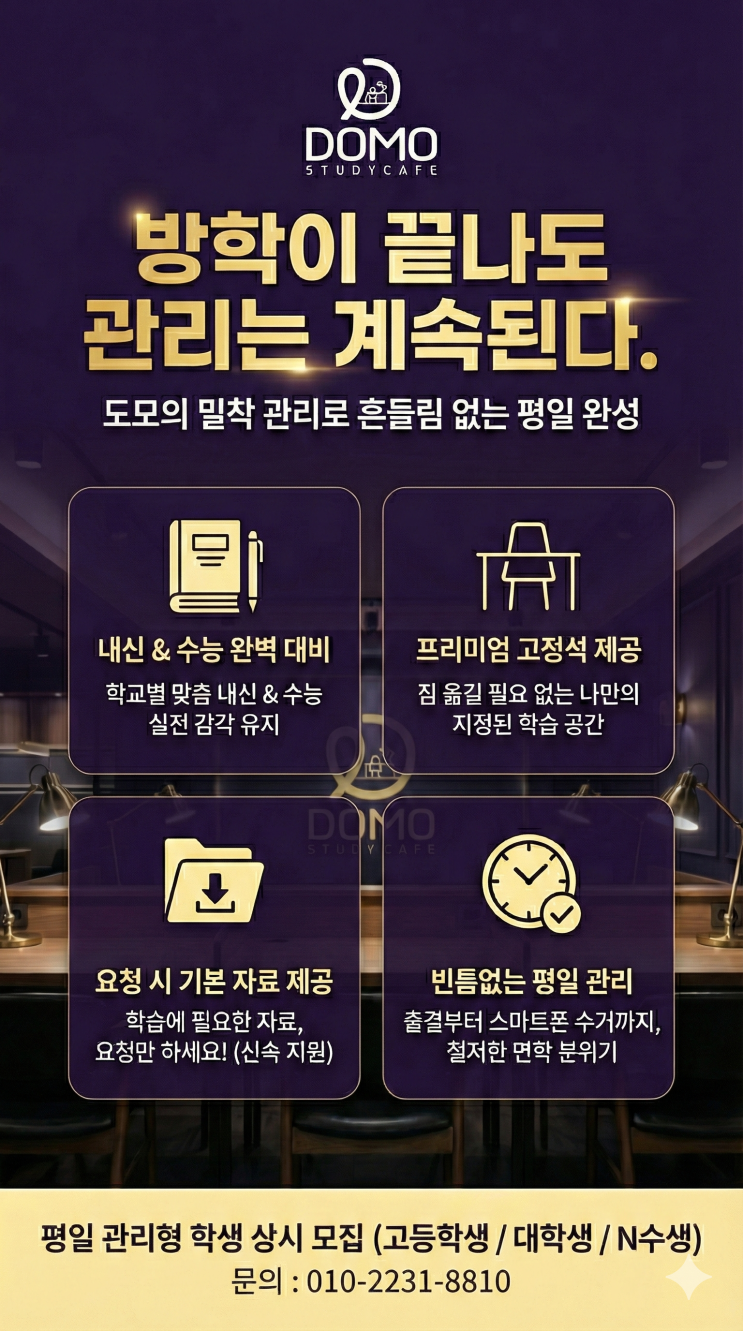 안녕하세요, 도모 스터디카페입니다. 개학을 불과 일주일 앞둔 지금, 학생들의 마음속에는 설렘보다 앞서는 복잡한 긴장감이 자리 잡고 있을 것입니다. 방학이라는 긴 호흡을 마무리하고 다시 학교라는 일상으로 복귀해야 하는 이 시점은, 한 학기의 성패를 결정짓는 가장 예민하고도 중요한 분기점입니다. 많은 이들이 성적의 차이를 '지능'이나 '의지'에서 찾으려 하지만, 저희가 현장에서 지켜본 진실은 다릅니다. 최상위권의 몰입을 완성하는 것은 결코 흔들리지 않는 굳건한 의지만이 아닙니다. 오히려 유혹의 선택지 자체를 제거하고, 오직 학습에만 전념할 수 있도록 설계된 ‘견고한 시스템’이 그 차이를 만듭니다....... <img src="https://blogthumb.pstatic.net/MjAyNjAyMjVfMTI0/MDAxNzcyMDE5MDQwNjU2.AP16QiRFreLwneXEr3UXBcBrFTrK9Tox1A4MKkZCYn0g.lz50cQWCjVLPrnW0hGrHTRahpHE0_VgkVe6qTGAchRkg.PNG/Gemini_Generated_Image_4vw8ga4vw8ga4vw8.png?type=s3" />