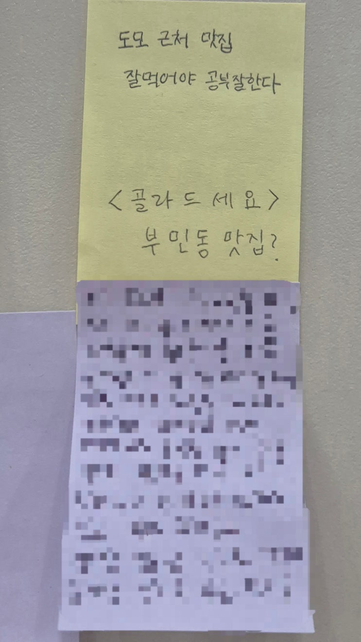 안녕하세요, 도모 스터디카페입니다! 우리 도모는 학생들이 자유롭게 소통하는 게시판이 하나 있죠. 서로 응원도 하고 소소한 정보도 나누는 활발한 공간인데, 최근 아주 흥미로운 걸 발견했습니다. 바로 빼곡하게 적힌 이 맛집 리스트! 누군가 "잘 먹어야 공부 잘한다"는 따뜻한 마음으로 정성스럽게 남겨주셨더라고요. 가만히 읽어보니 우리 도모가 동아대 부민캠퍼스 바로 근처라 그런지, 동네 사정 훤한 분들만 아는 '진짜'들만 모여있었습니다. 대학가의 활기찬 바이브는 챙기면서도, 맛은 절대 놓치지 않는 찐로컬 미식 5곳을 엄선해 소개합니다. 오늘은 공부 생각은 잠시 접어두고, 오직 '맛있는 점심'에만....... <img src="https://blogthumb.pstatic.net/MjAyNjAyMjZfMjcw/MDAxNzcyMTA0NTY0ODEy.1QUkovufvZ3Y24sg-1k7vNlnzbcZnjhDOCVXejVl6sMg.IoJlqw-wKnXYc6w1aSCwQiiFOQQbJupFUYHwUZwSnlUg.JPEG/20260226_183417%281%29.jpg?type=s3" />