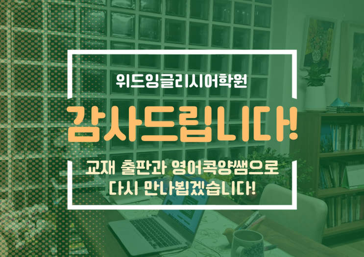 지난 21년 동안 감사했습니다. 대신동 영어학원 위드잉글리시 원장은 2026년 2월 12일에 마지막 수업을 합니다. 2006년 1월에, 대신동 영어학원 위드잉글리시를 개원하면서 '딱 10년만 하고 그만두겠다'라고 다짐했습니다. 저는 온 열정을 다해 10년 동안 영어를 지도하고, 그 후 어깨의 짐들을 덜어내고 자유롭게 제가 좋아하는 여행, 목공, 독서토론 등 소소한 일들을 하면서 살아갈 계획이었습니다. 10년이 된 2015년에, 저의 계획을 들은 부모님들이 일 년에 한 달 휴가를 하면서 학원을 계속 운영해 달라고 부탁했고 쉽게 정리하지 못한 마음의 인연들이 많아서 결국 지금까지 이어왔습니다. 서울이 고향인 우리는 남편의 정년퇴....... <img src="https://blogthumb.pstatic.net/MjAyNjAyMTBfMSAg/MDAxNzcwNjYwMzQ3Nzc3.vsc6d2k0GVdyzor97GR24EF_3XA0KK808XpoJ4PTd20g.-YkN5ETFY2CGRAN9EbD1JUD4Fp80zbP05BSIjxLpqDcg.PNG/B269%C7%A5%C1%F6.png?type=s3" />