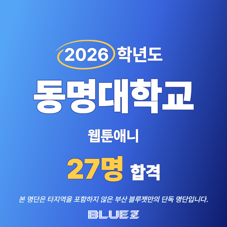 안녕하세요. 만화 애니메이션 입시전문 블루젯미술학원입니다. 오늘은 2026학년도 동명대학교 웹툰애니메이션학부 합격 소식을 기쁜 마음으로 전해드립니다. 2026학년도 동명대학교 웹툰애니메이션학부 ✨️27명 합격✨️ 노력한 만큼의 결실을 맺은 여러분께 진심으로 합격을 축하합니다. 남은 여정도 블루젯이 함께 응원하겠습니다. 이상!! 만화 애니메이션 입시전문 블루젯미술학원이었습니다. 본 명단은 타 지역을 포함하지 않은 부산 블루젯만의 단독 명단입니다. 예약 후 방문하시면 대기 시간 없이 상담받으실 수 있습니다. #동명대학교웹툰애니메이션학부 #동명대학교웹툰애니메이션 #동명대학교 웹툰 애니 <img src="https://blogthumb.pstatic.net/MjAyNjAyMTFfOTgg/MDAxNzcwODA5Mjc2MDY1.knSdKarFqENhvIBcJyQAklme3F0ZJ2e4AMOlOLmIGYog.t6-VC8ig-H82wD8tlMhQ0JDFU2uP0QJObm7sOpvDw9Ig.PNG/%B5%BF%B8%ED%B4%EB.png?type=s3" />