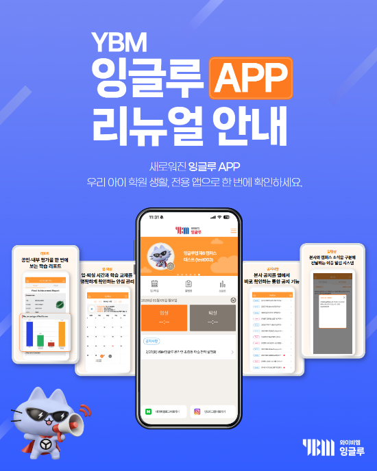 부산 명륜동의 초·중등 영어전문 YBM 잉글루의 영어 하는 야옹씨입니다. 아이를 학원에 보내시는 학부모님들께서 가장 많이 하시는 말이 있습니다. “오늘 아이 잘 도착했나요?” “공지 문자가 많아서 놓칠 때가 있어요.” 이런 불편함을 조금이라도 줄이고, 아이의 학원 생활을 더 투명하고 안심되게 보여드리기 위해 이번에 YBM 잉글루 전용 학부모 앱이 새롭게 론칭되었습니다. 왜 학원(교습소) 전용 앱이 필요했을까요? 요즘 학부모님들은 단순히 ‘수업을 듣는다’보다 아이가 언제 도착했고 언제 나갔는지 학원에서 어떤 공지가 있었는지 내가 놓친 정보는 없는지 를 굉장히 중요하게 생각하십니다. 기존 문자나 단체 메시지는 다른 알림....... <img src="https://blogthumb.pstatic.net/MjAyNjAyMDFfMjAy/MDAxNzY5OTQ0NDE4MzUz.CoCv71aaASIc51Kv-zEyeTcxBd7uKBlv5452Kj7_Dygg.o-HDl4-A4JCb0rJUmsyX9xVxDTzeeYCgDsPxMW3BqHcg.PNG/550%A3%DF1769766561887.png?type=s3" />