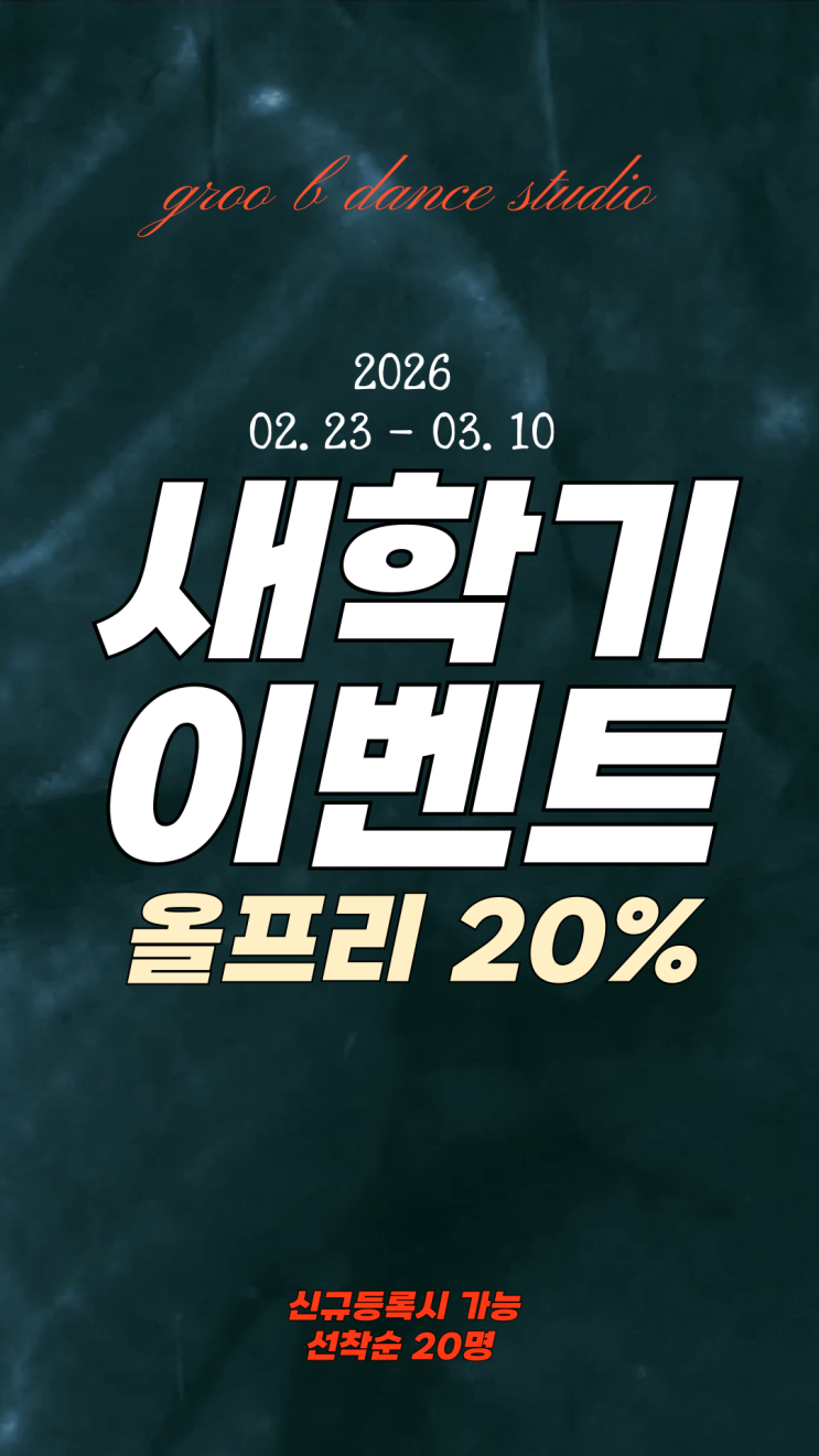 안녕하세요 그루비댄스스튜디오학원 입니다 ! 경성대 부경대역 5번출구에 위치한 부산댄스학원 입니다 !!! ----------------------------------- 051-612-1058 010-5851-1259 ----------------------------------- 수강문의나 궁금하신점 있으시면 언제든지 문의 주시면 됩니다 단! 너무 늦은시간이나, 저의 수업시간에 전화를 하신다면 제가 못 받을 수도 있어서 다시 전화를 할테니 조금만 기다려주시면 감사하겠습니당 ㅎㅎ 그럼 오늘은 새학기 이벤트를 들고왔어요 호호 올프리가 20프로 케이팝,스트릿 무관하게 일주일 2회 수업이 10프로 할인이 됩니다 그리고 수업 수강은 먼저 ! 수업을 들어보시고 하는게 나으셔서 옆에 프리 쿠폰까지 적....... <img src="https://blogthumb.pstatic.net/MjAyNjAyMjRfMjY0/MDAxNzcxOTIwNDA4ODI0.hTsXAfJXDxPc7-NGsx5omYTet4D_-kfaOfPx6DSdjTMg.SHt1LaYnQt_Tb4bRP9VlSQqiGJ7zI1x__CD8BZ_vW-8g.PNG/%3F%A0%9C%EB%AA%A9%EC%9D%84-%3F%9E%85%3F%A0%A5%3F%95%B4%EC%A3%BC%EC%84%B8%3F%9A%94_-001_%2819%29.png?type=s3" />
