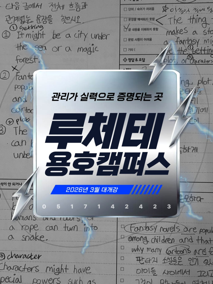안녕하세요. 용호동 영어학원 루체테 글로벌 캠퍼스입니다. 3월은 모든 아이들의 공부 리듬이 다시 짜이는 달입니다. 3월 대개강(전 레벨 개강)을 앞두고, 오늘은 루체테가 왜 ‘꼼꼼한 학원’으로 기억되는지를 아이들의 학습 기록으로 보여드리려 합니다. 1) “열심히 했다”가 아니라, “어디가 흔들렸는지”를 잡아줍니다. 공부는 결국 오답이 오답인 채로 남지 않게 하는 습관 싸움입니다. 왜 이 보기를 골랐는지 어떤 단어에서 판단이 멈췄는지 문장 구조를 어디서 놓쳤는지 다음엔 어떤 근거로 고치면 되는지 이걸 “선생님의 해설”만으로 끝내지 않고, 아이 머릿속 흐름을 다시 설계하는 것. 그래서 루체테의 오답 관리는 단순히 “정답....... <img src="https://blogthumb.pstatic.net/MjAyNjAyMjVfMTYz/MDAxNzcyMDIyMjUzODIw.rptaOUUnMcyk8op4idApAEvx1gJz6wFnyBRdiEgZBYwg.R580yNC4RyV2uL2s0RIDJh3nOeqGN1woU_w9FO50FR4g.PNG/image.png?type=s3" />