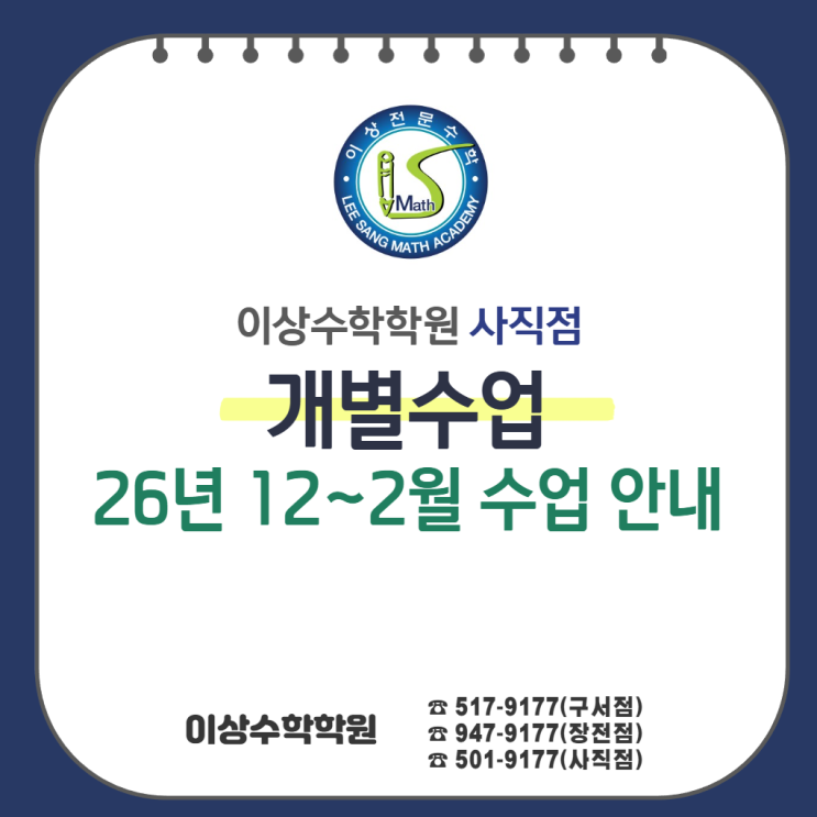 이상수학학원 사직점 Ⅰ26년 12월~2월 수업 안내