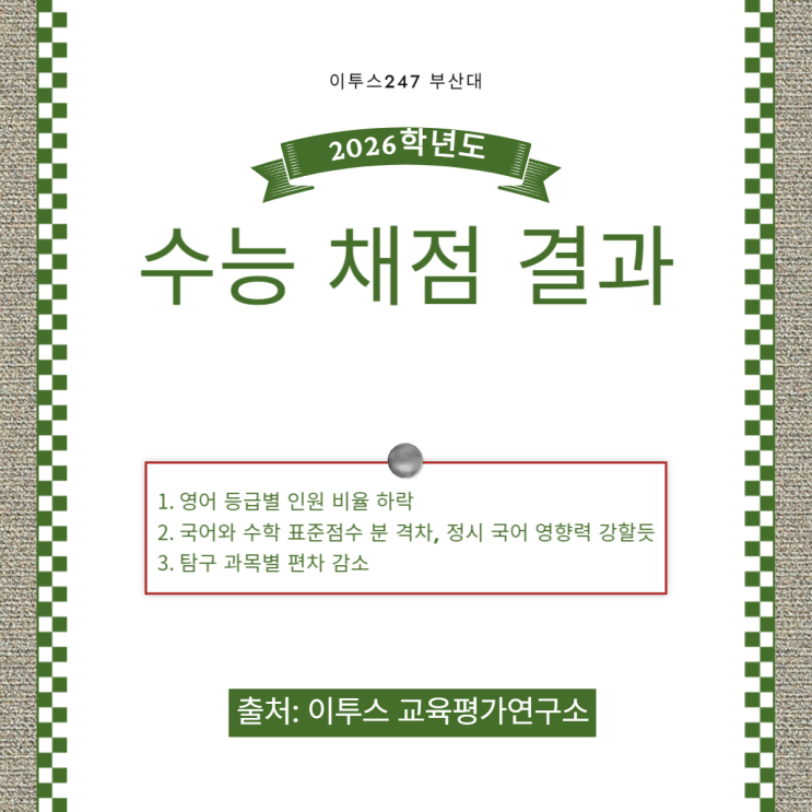 안녕하세요, 이투스247 부산대점입니다. 날씨가 많이 추워져 본격적인 겨울이 시작되었는데요! 추워진 날씨에 건강 유의하시길 바라며 오늘은 수능 채점 결과에 대해 알아보려 합니다. 출처는 이투스 교육평가연구소입니다. 2026 정시 모집 주요 변수는 영어, 국어, 탐구 가산점 영어 영향력 적은 대학 쏠림 현상 주의 국어 변별력 상승으로 수학 성적 보완 가능성 커져 탐구 과목별 편차 줄어 가산점 적용 효과 클 듯, 가산점 없는 학교 쏠림 현상 주의 1. 영어 등급별 인원 비율 하락 이번 수능 영어 1등급 인원은 2024학년도보다 1.6%나 낮은 3.11%로 정시 모집 지원뿐 아니라 수시 모집 결과에서도 주요 변수가 되었습니다. 특히 2등급 누적....... <img src="https://blogthumb.pstatic.net/MjAyNTEyMDVfMjU1/MDAxNzY0OTI5NDE5OTk5.vJMjvzEQmfSf7zbLPJd1eN4GiInPk4hIWQkd1HmgoPYg.vT6Z7eydm9YIiz4xEstpfNaQyt-8y1Xybz4QWNtYuycg.PNG/%BC%F6%B4%C9_%C3%A4%C1%A1_%B0%E1%B0%FA.png?type=s3" />