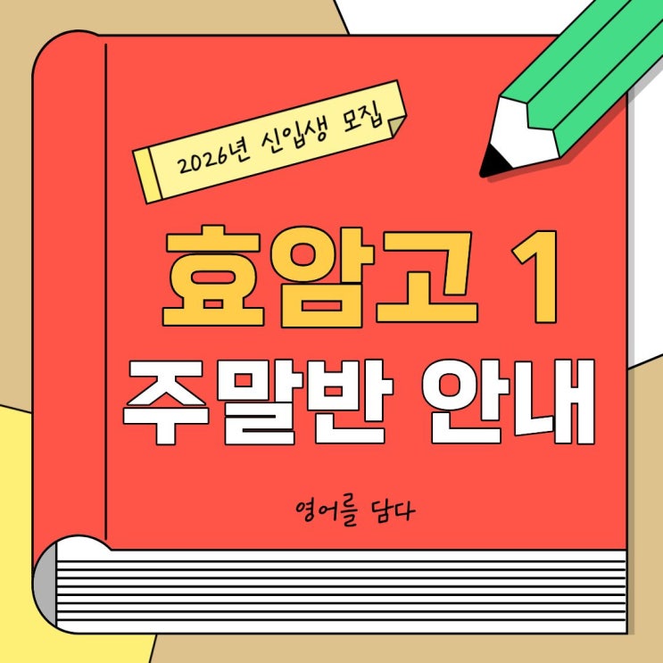 안녕하세요. 영어를 담다 원장 전재석입니다. 지금 중·고등부는 기말고사가 한창입니다. 우리 재원생들 모두 정말 잘하고 있고, 끝까지 힘내고 있습니다. 오늘은 예비 고등학생(2026학년도) 주말반 개설 안내를 드리려 합니다. 저희 영어를 담다 재원생 중 양산 효암고 입학이 확정된 학생이 여러 명 있어 2026년에는 효암고 대상 주말반이 새롭게 개설될 예정입니다. 효암고 주말 영어반 안내 대상 : 2026학년도 효암고 신입생 수업 요일 : 토요일 + 일요일(주말 집중반) 수업 시간 : 추후 확정 (2월 중 재원생 스케쥴 기반 조정) 효암고 신입 여러분, 영어 내신은 영어를 담다가 확실하게 책임지겠습니다. 고등 첫 단추를 올바르게 꿰야 성....... <img src="https://blogthumb.pstatic.net/MjAyNTEyMDZfMjIy/MDAxNzY1MDAwNjQ5NTEw.7Uvp8Za1qnG8morspHOPBA7wmGp9PcDURmTD_cLl4Okg.9bQPg2k7YKMKxV3LUQyOGbHkQJBbWEHhZD88p-wA4jIg.JPEG/%C1%A6%B8%F1%C0%BB_%C0%D4%B7%C2%C7%D8%C1%D6%BC%BC%BF%E4._%2821%29.jpg?type=s3" />