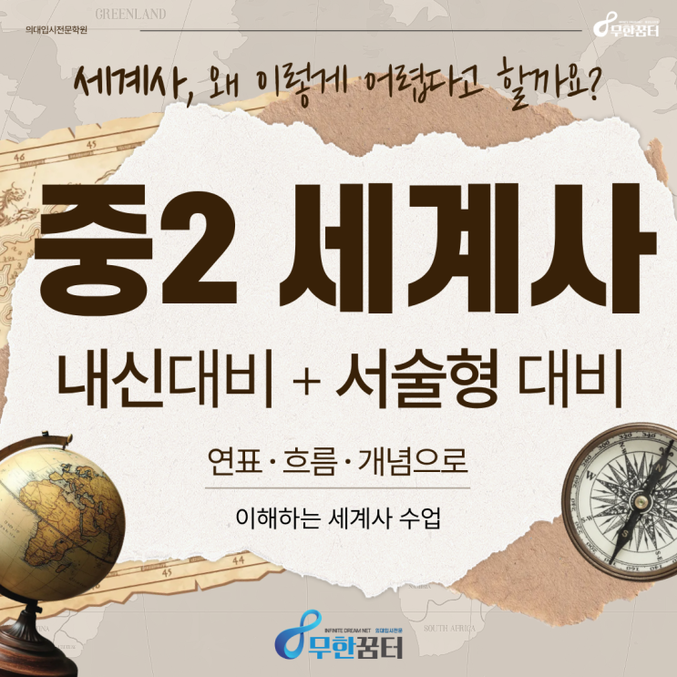 안녕하세요 김해 내신 대비 전문 관리 학원 무한꿈터 김해관입니다 ♾️ 중2 세계사, 아직도 “외우는 과목”이라고 생각하시나요? 많은 학생들이 시험 직전에 외우고, 시험 끝나면 바로 잊습니다. 그 결과는? ✔ 시험 때 문제 적용 못함 ✔ 서술형에서 점수 손실 ✔ 점수 들쭉날쭉 결국 성적이 안정적으로 안 나옵니다. 중2세계사, 이렇게 나오고 있습니다 최근 내신 흐름은 단순 암기 ❌ 흐름 이해 + 개념 연결 ⭕ 서술형 대비 필수 ⭕ “외우기만 한 학생”은 점수가 안 나오는 구조입니다. 그래서 시험 전에 시작하면 늦습니다 세계사는 시험 2~3주 전에 시작해서 되는 과목이 아닙니다. 이미 그때는, ❌ 개념이 안 잡혀....... <img src="https://blogthumb.pstatic.net/MjAyNjAzMzFfMjI3/MDAxNzc0OTY0MzY1NjM1.uSylFCoyz1SUZQO6PaRGu-b8qX9-IyKbxlrFh8iwovog.1nqHMotlhRHj6OI-3EopB9KAIEtMJNobowbThRCj_0Qg.PNG/%C1%DF2_%BC%BC%B0%E8%BB%E7_%BA%ED%B7%CE%B1%D7_%C3%B9_%C8%AD%B8%E9.png?type=s3" />