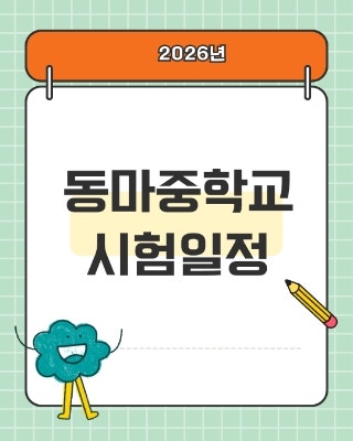 2026학년도 시험 일정을 학년별로 정리했습니다. 중1은 2학기에 시험이 실시됩니다 동마중학교 중간·기말, 중2·3은 4번 전체 일정과 영어듣기평가·수행평가 비율까지 마루수학이 안내합니다. 안녕하세요, 꼼꼼한 마루수학 선생님입니다. 중학교 올라가면 달라진다 실제로 가장 크게 달라지는 것 중 하나가 바로 시험 구조입니다. 초등학교 때는 담임 선생님이 단원평가 날짜를 직접 챙겨주셨지만, 중학교부터는 학부모님이 먼저 일정을 파악하고 아이와 함께 준비 흐름을 잡아줘야 합니다. 오늘은 동마중학교 공식 안내문을 기준으로 학년별 시험 일정, 과목 구성, 수행평가 비율까지 한 번에 정리해드립니다. 북마크해두시고 꼭 활용해보세요. 학....... <img src="https://blogthumb.pstatic.net/MjAyNjAzMjdfMTc4/MDAxNzc0NTY2MzE5Mzc4.gaeyrXAWKyFlL4I8zekw3iOGF1rpAZmrI0UPnFUcdBMg._wRCO8BMgZ1hrG4FhXn7ZdVhshArShLpzi8Ytf_Z7Fsg.JPEG/320%A3%DF%C1%D6%C8%B2%BB%F6_%B1%CD%BF%A9%BF%EE_%C4%B3%B8%AF%C5%CD_%B0%B3%B0%AD_%C4%AB%B5%E5%B4%BA%BD%BA_%C1%A6%B8%F1_%C0%CE%BD%BA%C5%B8%B1%D7%B7%A5_%B0%D4%BD%C3%B9%B0%A3%DF20260326%A3%DF080536%A3%DF0000.jpg?type=s3" />