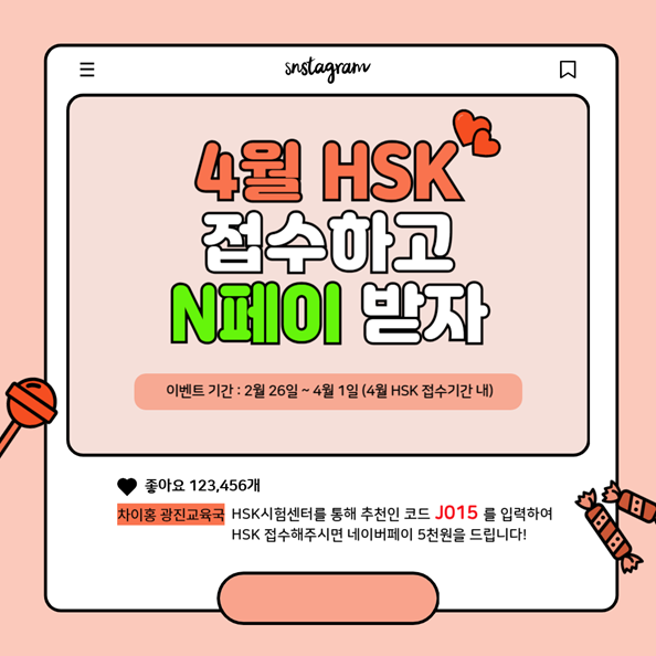 EVENT 4월 HSK 접수하면서 추천인 코드 J015 입력하고 네이버페이 5천원 받아가세요! 안녕하세요. 차이홍 중국어 & 대교 랭귀지 스퀘어 광진점 입니다. 지난주 일요일 3월 HSK 시험 보시느라 모두 고생 많으셨습니다 4월 HSK 접수마감일도 얼마 남지 않았는데요, 계획 있으신 분들은 서둘러 주세요! 이미 접수 완료 후 준비하고 계신 분들 모두 모두 加油 jiāyóu (파이팅) 입니다! 오늘은 4월 HSK 일정, 고사장 등 관련 정보들 빠르게 총정리 해드리고 간단한 이벤트까지 안내드릴게요 4월 HSK 일정 4월 HSK 고사장/응시료/입실시간 4월 HSK 추천인코드 J015 입력하시고 네이버페이 5천원 받아가세요! (HSK, HSKK 모두 가능) 1️⃣ 네이....... <img src="https://blogthumb.pstatic.net/MjAyNjAzMjdfMzUg/MDAxNzc0NTk0OTk1NTU3.uOLpMq7QpM3mCYkaPhDDgMcmUUtT8uD3JeaWMJRntP0g.40vCKFQ4XIeB6Z2_BejIAU127JVDKOqDAIgN988RHWkg.PNG/%B4%EB%C7%A5%BB%E7%C1%F8.png?type=s3" />