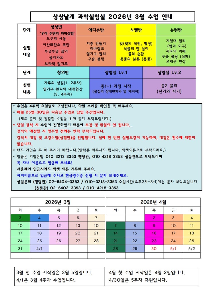 안녕하세요. 상상날개 과학실험실 지킴이입니다. 2026년 3월 교육과정 안내입니다. 1) 창의반 개설 2) 장영실반 레벨별 분류 두 가지 변동사항이 이번달부터 반영됩니다. 계속하여 과학을 즐겁게 공부하는 공간을 만들겠습니다. <img src="https://blogthumb.pstatic.net/MjAyNjAyMjZfODcg/MDAxNzcyMDk3MzUxMjQz.K2d34spaS72oIiLGKiodBKThvVmmT7RVXpPlD2Bs5I8g.adTsnAZox_DLgJZ4KFyAHxD49M-E1QX31CY-8qlbs-4g.JPEG/2026%B3%E2_3%BF%F9_%BC%F6%BE%F7%BE%C8%B3%BB001.jpg?type=s3" />