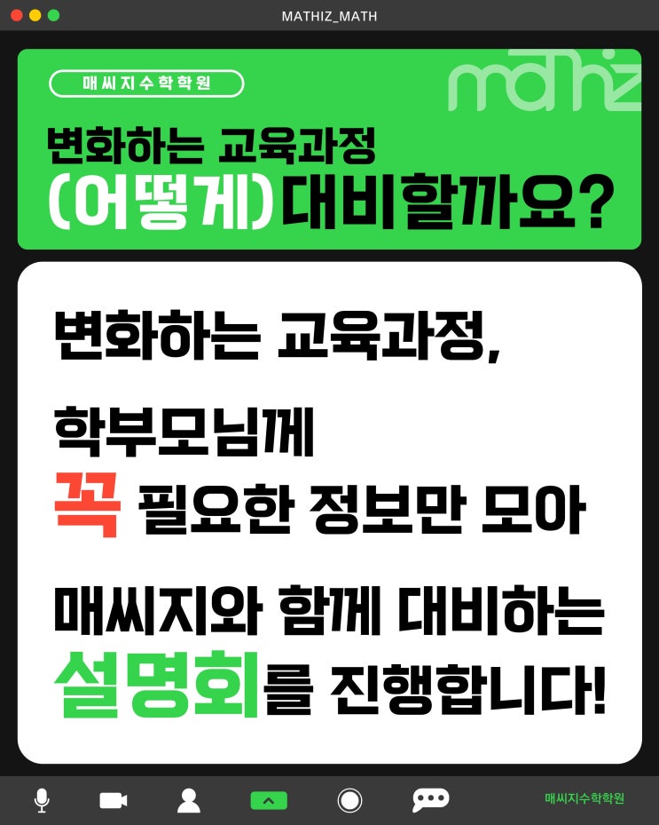 안녕하세요, 매씨지수학학원입니다 최근 교육과정이 빠르게 변화하면서 학부모님들께서도 “이제 무엇을 기준으로 준비해야 할까?” 고민이 많으실 시기라 생각됩니다. 특히 2022 개정 교육과정은, 단순한 정보 나열이 아닌 정확한 이해가 더욱 중요해졌습니다. 이에 매씨지수학학원에서는 학부모님께 꼭 필요한 내용만 정리한 2022 개정교육과정 대비 입시전략 설명회를 진행합니다. 이번 설명회는 변화하는 교육과정을 정리하고, 자녀의 수학 학습 방향을 어떻게 잡아야 할지 현실적인 기준을 제시해 드리는 자리입니다. 설명회에서는 ✔️ 2022 개정 교육과정 핵심 정리 ✔️ 중·고등 수학에서 달라지는 학습 포인트 ✔️ 효율적인 학습 전....... <img src="https://blogthumb.pstatic.net/MjAyNjAxMjZfMjE5/MDAxNzY5NDIzOTgxMjMw.RmzBfH_mrsnCVkEj2eFAQIRG9TzrCWIN_9z32T7XjdYg.d4tjHbQIk8gLOs5He6WYpqELh9qYsdqxv4IkrV5VPgIg.JPEG/1.jpg?type=s3" />