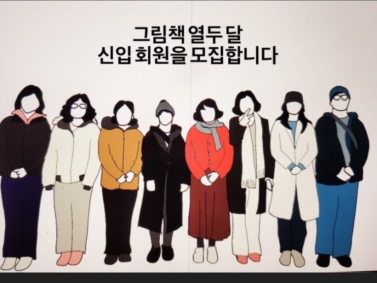 2026년 ‘그림책 열두 달’신입 회원을 모집합니다 작년부터 신입 회원을 받기 시작했으며 2026년에는 신입회원 네 분을 모집합니다 그림책을 사랑하는 분은 누구나 신청이 가능합니다 ❣️관심 있으신 분은 문자주세요 010 5590 9622 (선착순 마감) 매월 1주 3주 월요일 09:30 ~11:30 모임은 3월부터 시작합니다(3/5 첫 모임) 장소는 레나의 그림책 정원입니다 신천 도서관에서 그림책을 함께 출판한 것이 인연이 되어 그림책 열두 달을 시작한 지가 벌써 3년 차가 되었습니다 그림책 열두 달은 2024년도는 실험적으로 그림 에세이를 출판하였으며 2025년도는 본격적으로 기획 회의와 편집 회의를 진행하며 일 년 간 공저를 준비했습니다 오늘 최....... <img src="https://blogthumb.pstatic.net/MjAyNjAxMjZfMjk5/MDAxNzY5NDM1Mjc0MTU2.voeswu21Pux_fZzrqaG947Wy2nR1B4Bh5LOLC6gqp9Mg.HKw0GTKv9SHQbJNktvVOkgSu-ZlCdXTDkOOsR-N47TMg.JPEG/6EBA7693%A3%ADE73C%A3%AD4DE8%A3%ADB683%A3%AD996F2C2840B0.jpg?type=s3" />