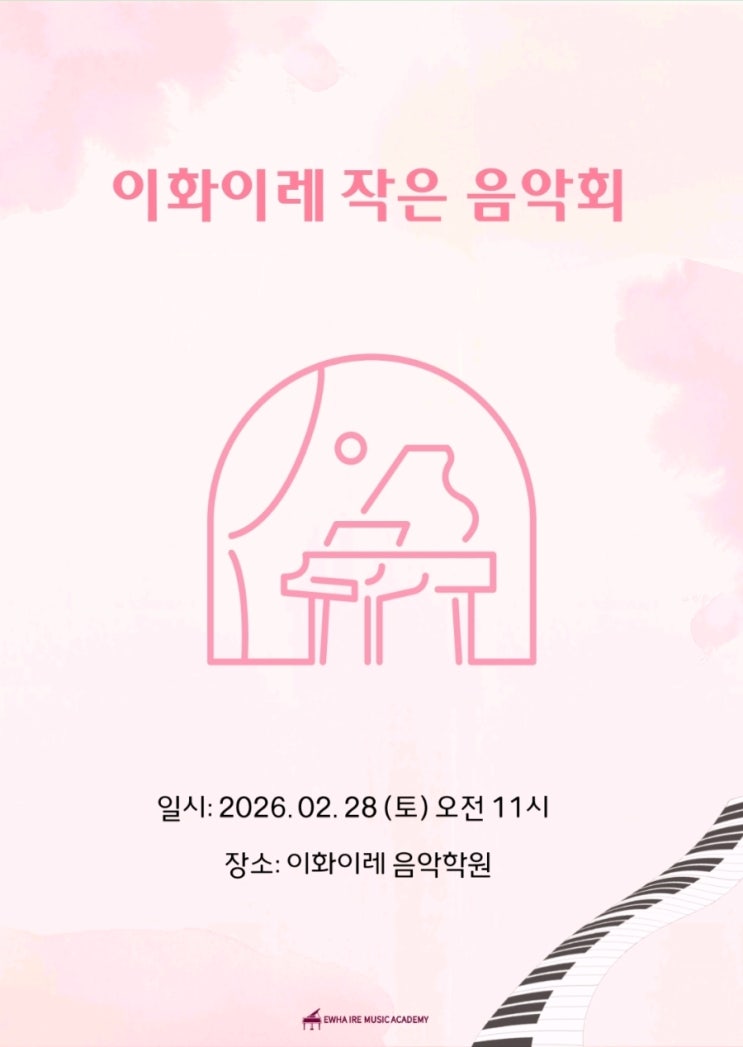 안녕하세요 :) 이화이레 음악학원입니다. 이화이레 초1 막내둥이들이 부모님을 모시고 작은 음악회를 했어요. 저희 팜플렛 넘 예쁘지 않나요? 예쁜 팜플렛만큼이나 씩씩하고 아름다웠던 이화이레 막둥이들의 연주 이화이레의 작은 음악회에 대해 소개합니다! 첫 번째 연주자는 유치부 *현이 배운대로 계이름을 노래부르며 연주했지요! 너무 사랑스럽고 씩씩한 *현이의 연주에 엄마 미소 한가득 두 번째는 아빠한테 멋진 연주를 들려주고 싶어하는 울 둥이 :) 네 멋진 연주에 누군가 ‘와~’ 하고 감탄 하시네☺️ 세 번째는 모범생 *안이 늘 하던대로 안정적이고 차분한 연주 (그래도 속으로는 떨렸지?) 다음은 음악가 집안에서 태....... <img src="https://blogthumb.pstatic.net/MjAyNjAzMTZfMTM2/MDAxNzczNjU2ODk4MzQw.B3x_1hbAXvw8qVVMTpDijnNrabZynwf-i0I8qC8AfY8g.KwRXNoA4er7h6xkTofwJhvNazZchIj2u6ROoWoLoz9kg.JPEG/900%A3%DFScreenshot%A3%DF20260211%A3%DF152710%A3%DFPDF_Viewer.jpg?type=s3" />