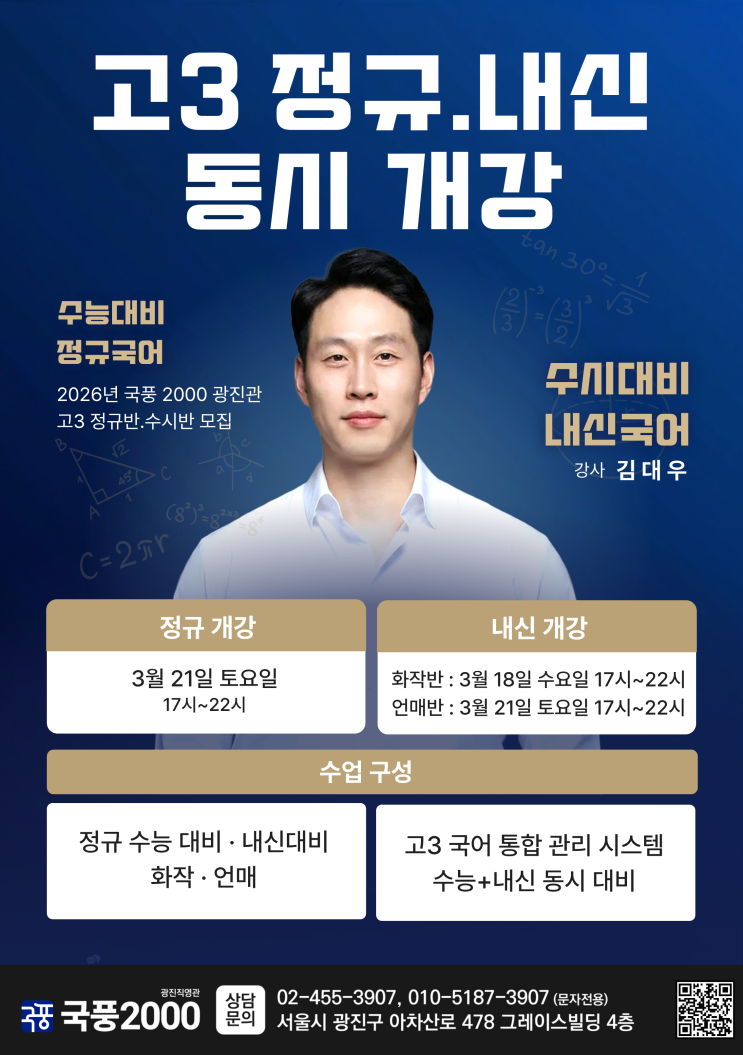 <국풍 2000 광진관> 고3 내신/정규 국어 대비 안내 2026학년도 수능은 전반적으로 독서와 선택과목의 난이도가 중요하므로, 3월 학력평가(수능)부터 자신의 위치를 파악하고 대비하는 것이 좋습니다. 고3 국어는 수능 공통과목(독서, 문학)과 선택과목(화법과 작문, 언어와 매체)으로 구성되어 있습니다. ■공통 과목(독문) [독서 완급 조절] 모든 문장을 똑같이 읽기보다는 핵심 키워드 중심으로 강약을 조절하여 시간 압박을 극복해야 합니다. [문학 연계 공부] EBS 수능특강/수능완성에 나오는 현대시, 고전시가 등의 작품을 철저히 분석해야 합니다. ■선택 과목 화작/언매 [화법과 작문] 지문을 빠르게 읽되 핵심 내용과 화자의 의도....... <img src="https://blogthumb.pstatic.net/MjAyNjAzMTdfMTkx/MDAxNzczNzQ1MDEyMjkz.VYZ8M7wZcCwJ4qQ3Uq9ONyciBpshVROpkUM-8YYnkkgg.VYeItgnqxCi9lhT6n6UGngzsUBYMntD0UR7vqNxO1Ngg.PNG/%B0%ED3_%C1%A4%B1%D4_%B3%BB%BD%C5_%B5%BF%BD%C3_%B0%B3%B0%AD.png?type=s3" />
