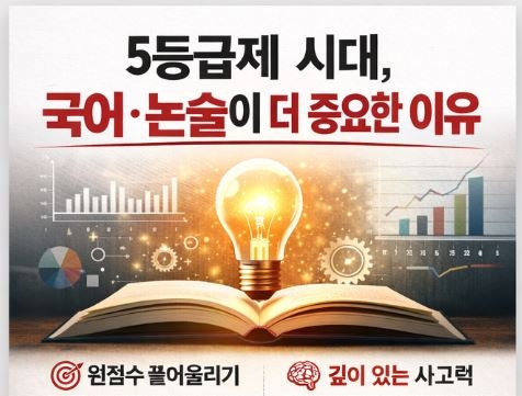 5등급제 시대, 국어·논술 학원이 더 중요해진 이유 2026년 1월, 코엑스에서 열린 2028 대입 정보 제공 설명회 현장은 예비 고1 학부모님들의 불안과 관심이 그대로 느껴지는 자리였습니다. 내신이 5등급제로 바뀌면서 “이제 내신 부담이 줄어드는 것 아니냐”는 기대도 있었지만, 설명회에서 나온 대학의 메시지는 오히려 그 반대였습니다. “대학은 등급보다 학생의 공부 과정을 본다.” 이 한 문장이 2028 대입의 본질을 정확히 설명합니다. 1등급이 많아질수록, ‘차이는 국어에서 벌어집니다’ 5등급제가 되면 상위권 학생 상당수가 1등급을 받게 됩니다. 그러면 대학은 무엇으로 변별할까요? 원점수 세부능력 및 특기사항(세특) 과목 선택....... <img src="https://blogthumb.pstatic.net/MjAyNjAxMDlfMjA1/MDAxNzY3OTUyNDc0MDkw.HduTgRFyWI-jzYfRUnGwNzGztPSRWzHLStIuDyiuIQog.5ZhaVov_8672dW4cTmgsg5mC7Zw8RnD1EC0nCH_tpj8g.JPEG/%C4%B8%C3%B3.JPG?type=s3" />