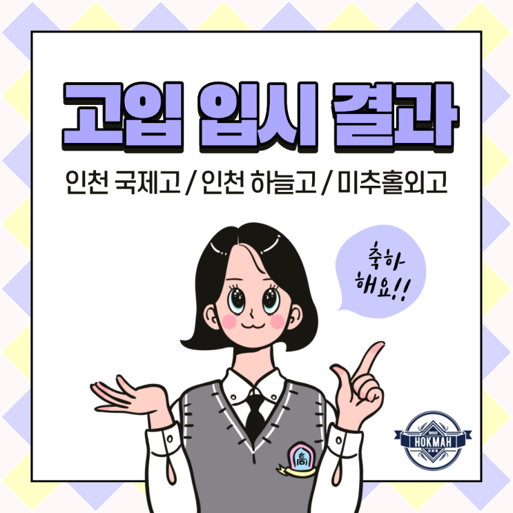 안녕하세요. 호크마에듀학원입니다. 오늘은 2026학년도 고입 합격 소식 전해드립니다!! 학생 한 명, 한 명의 가능성을 끝까지 믿고 함께 달려온 호크마에듀학원입니다. 2026학년도 고등학교 입시에서 호크마 재원생들이 우수한 결과로 합격하는 값진 성과를 이루었습니다. 단순한 성적 관리가 아닌, 중학교 전 과정 학습 설계 + 학교별 맞춤 전략이 만들어낸 결과입니다. ✅ 고입 합격 결과 인천국제고등학교 중산중3 이○○학생 미추홀외국어고등학교 공항중3 주○○학생 인천하늘고등학교 영종중3 박○○학생 총 3명 전원 합격 너무 너무 축하합니다!!! ✍️ 호크마에듀학원 고입 입시준비 1️⃣ 중등 내신 + 비교과까....... <img src="https://blogthumb.pstatic.net/MjAyNjAxMDlfMzYg/MDAxNzY3OTQ3MzgyMDMx.Pbr1AeiplXGBIVA8PS-AkIcbxz2XwhPA-3P12MHiZwwg.DXUJk96pFmVht35-z5IJHAY3q8JoYDH4Fulb_EM-JyIg.PNG/%C1%A6%B8%F1%C0%BB_%C0%D4%B7%C2%C7%D8%C1%D6%BC%BC%BF%E4_%2819%29.png?type=s3" />
